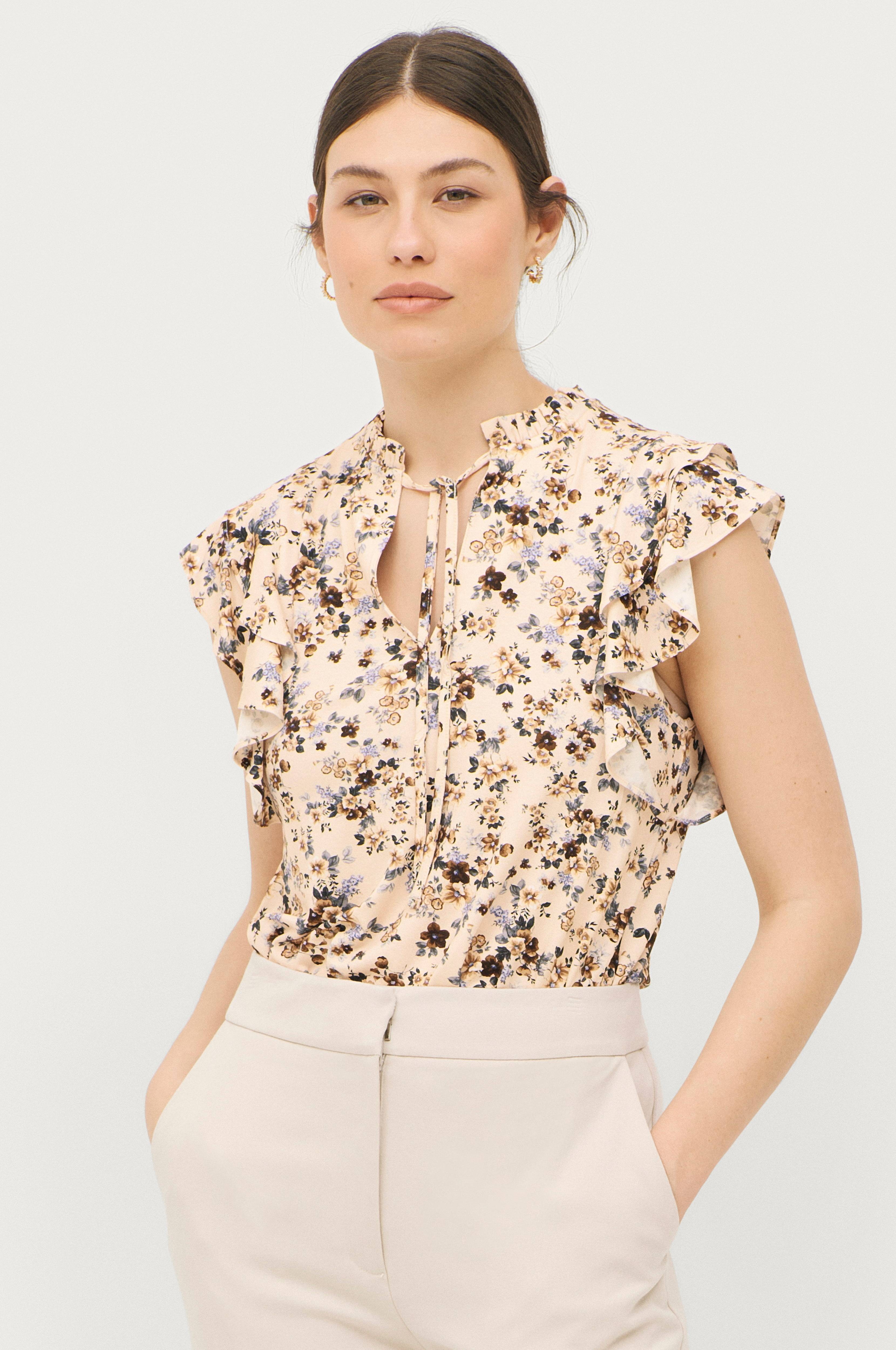• Topp i viskostrikå• Korta volangärmar• Volang vid halsringningen• Sprund med knytband fram• Längd: 65 cm i storlek 34/36