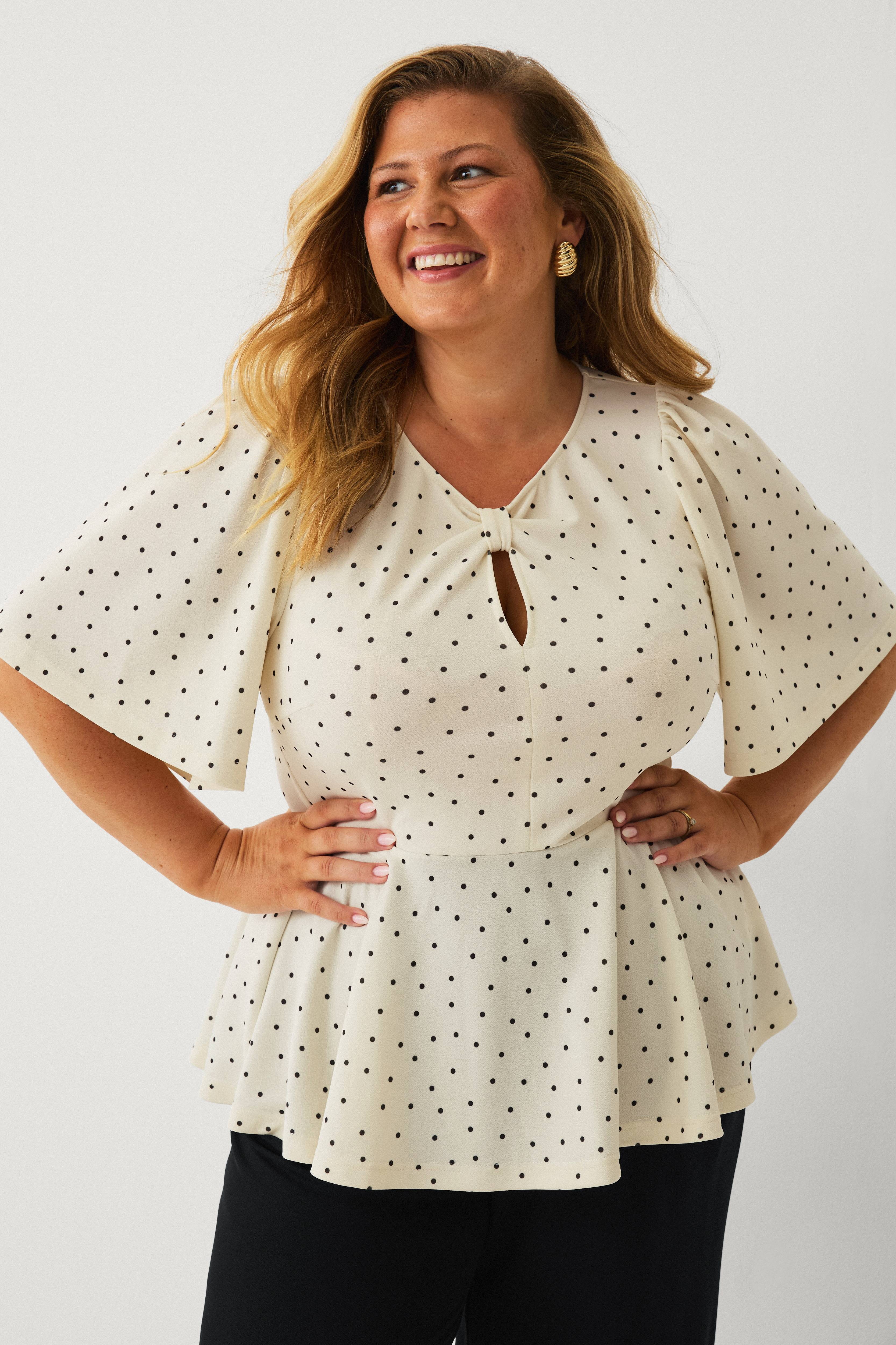 • Stretchig topp med korta puffärmar • Rundad halsringning med rosettdetalj och liten öppning • Avskärning i midjan med resår baktill • Utsvängd nederdel • Produkten ingår i Ellos exklusiva kollektion tillsammans med Linda-Marie Assergård. • Längd: 71 cm i storlek L
