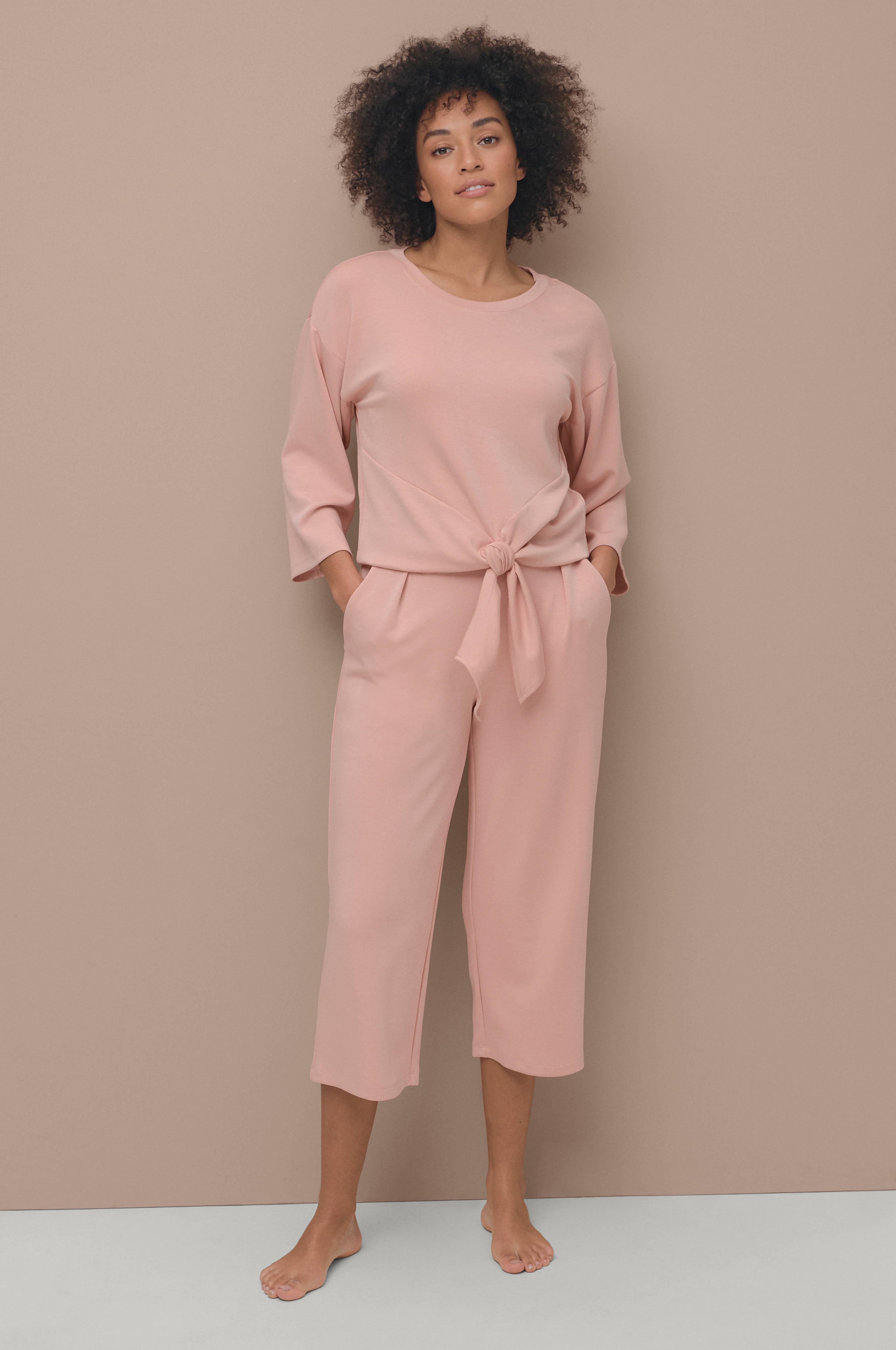 Topp i mjuk, stretchig och slät trikå med knyt nedtill fram. Lös, avslappnad passform. Nedhasade axlar och ärmar i 3/4-längd. Rund, ribbad halsringning. Längd ca 61 cm i stl 34/36.