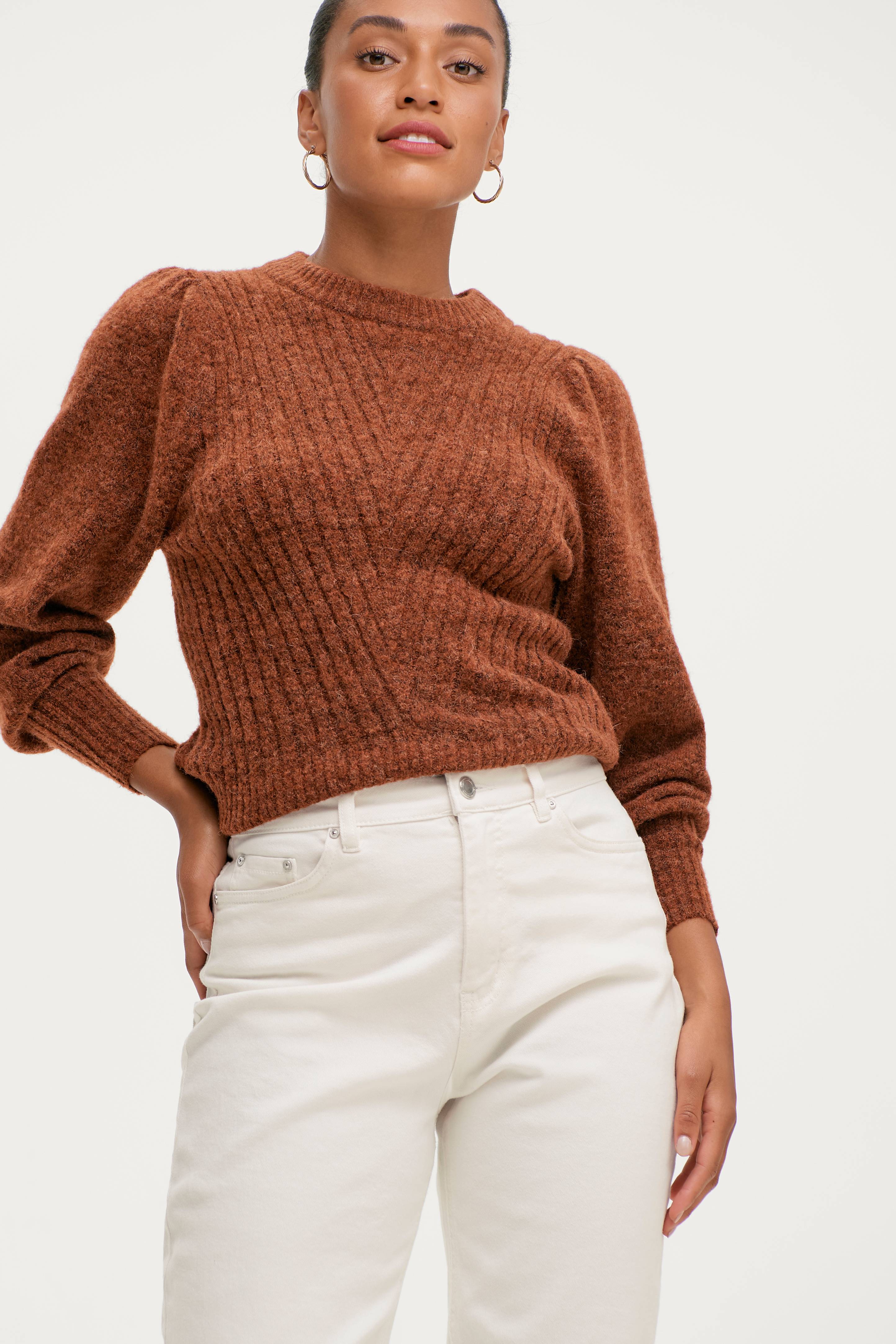 Tröja Emmali med smal passform och vida ballongärmar med puffärm och smal ribb i ärmsluten. Bred ribbstickning fram och bak och smalare ribb nedtill. Längd ca 61 cm i stl 34/36.