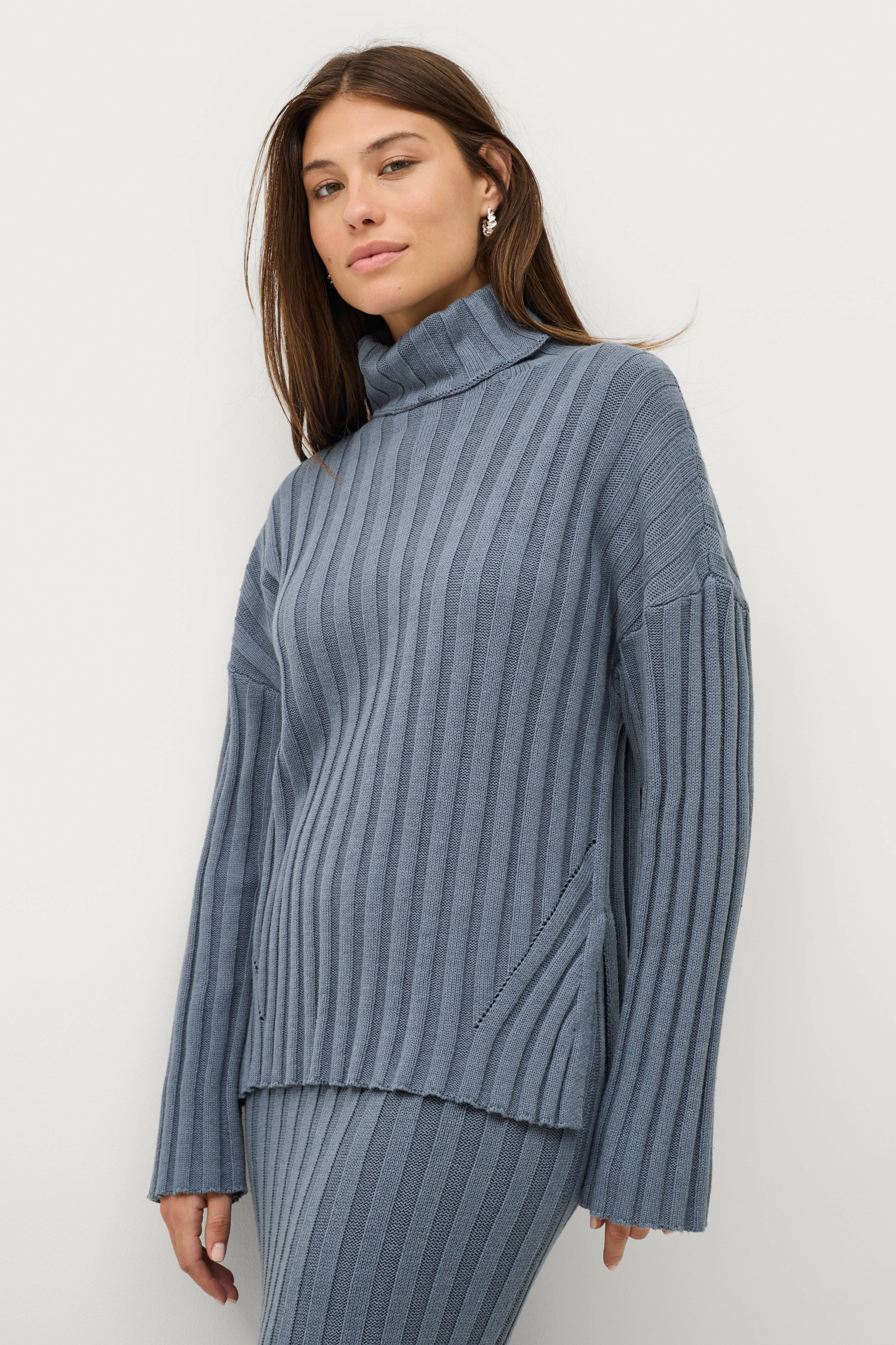 • Stickad tröja med ribbad struktur• Polokrage• Nerhasade axlar• Slitsar nedtill i sidorna• Något längre baktill• Längd: 74 cm i storlek 34/36