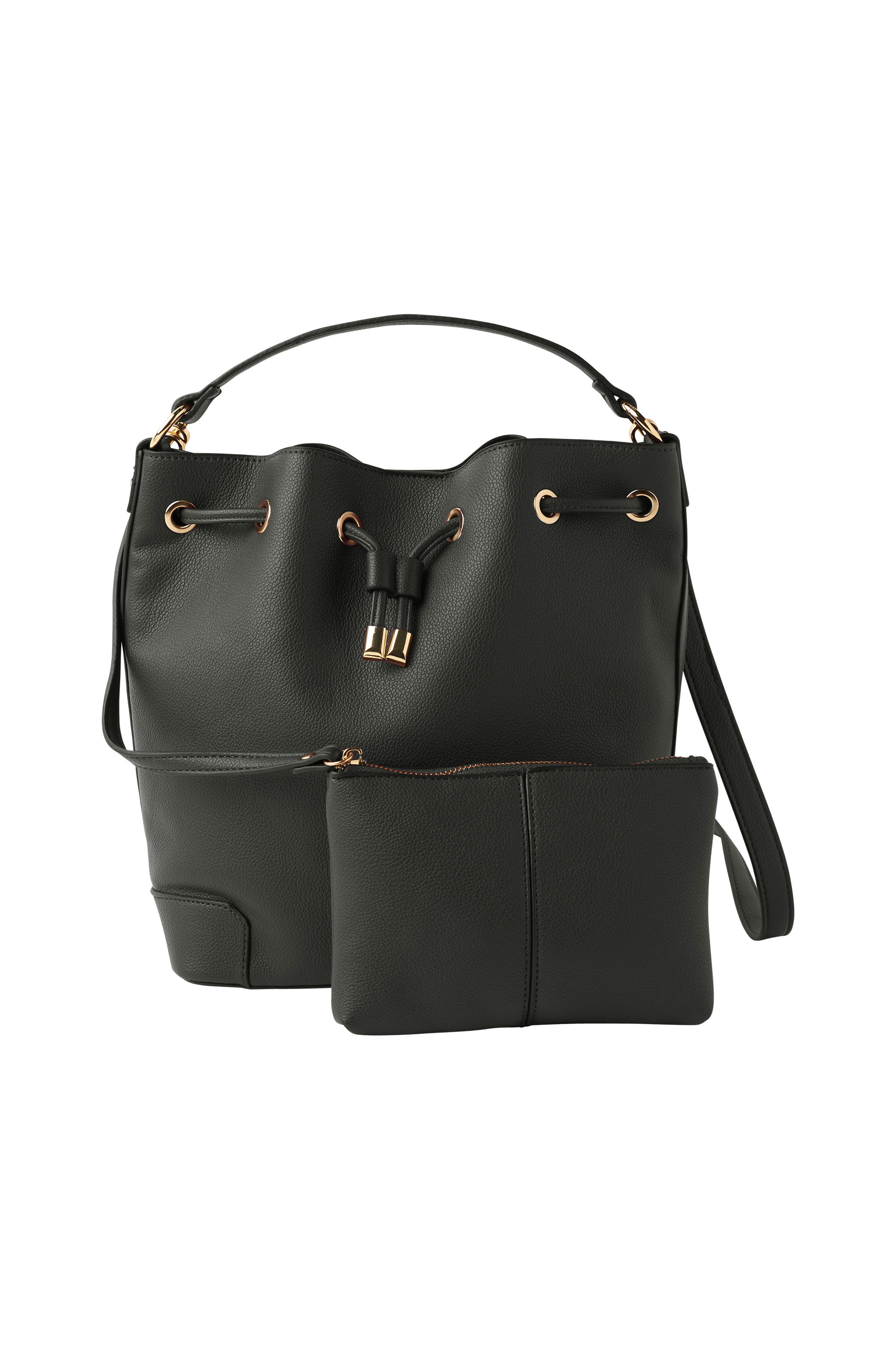 • Rymlig väska i skinnimitation • Dragsko upptill • Ofodrad • Bärhandtag • Avtagbar, justerbar axelrem • Matchande, avtagbar portmonnä • Mått: B 23 x H 28 x D 14 cm