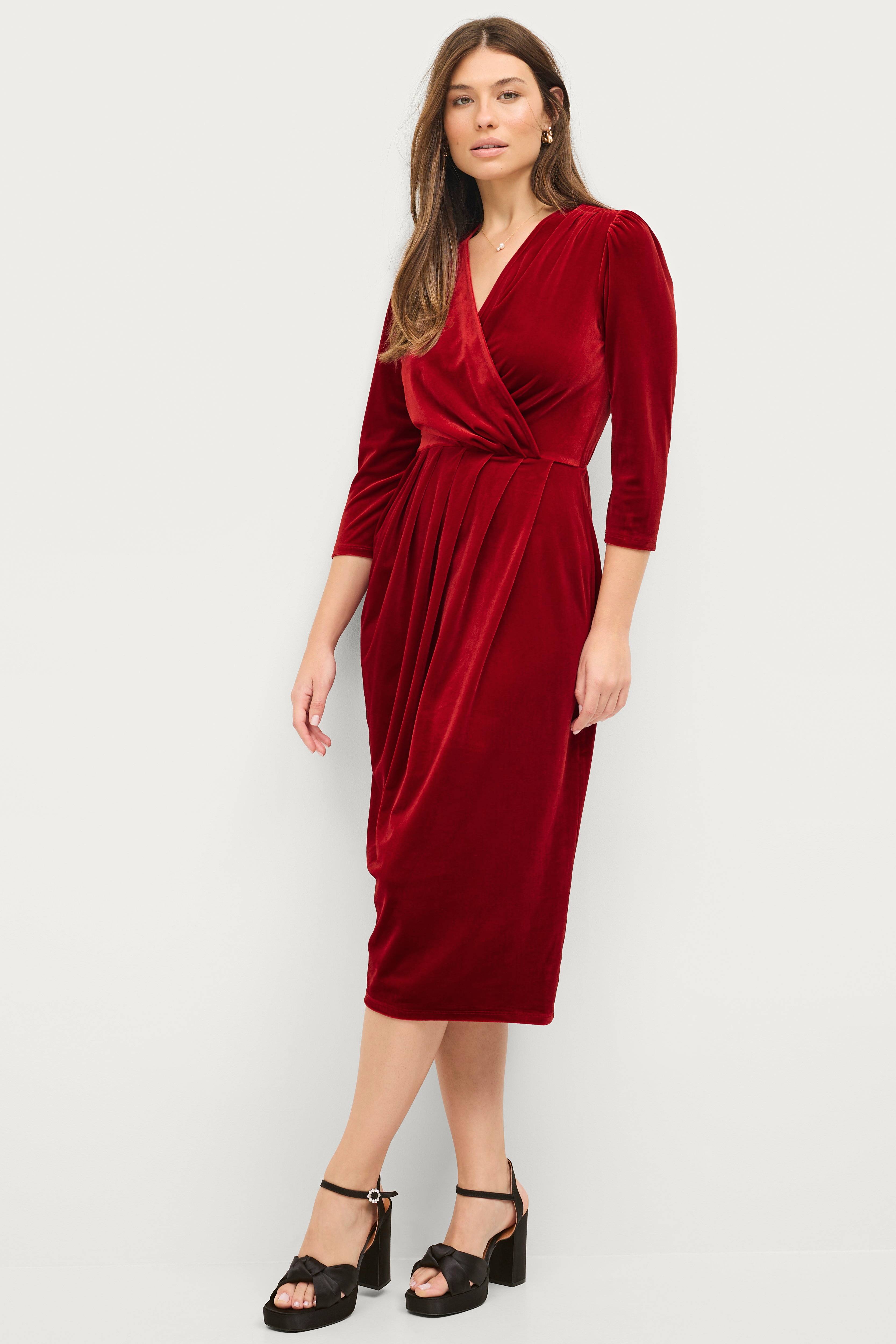 • Klänning i velour• Figurformad modell• Mjukt, stretchigt material• V-ringning med omlott• Rynk på axlarna• 3/4-långa ärmar• Veck i midjan• Längd: 118 cm i storlek 34/36