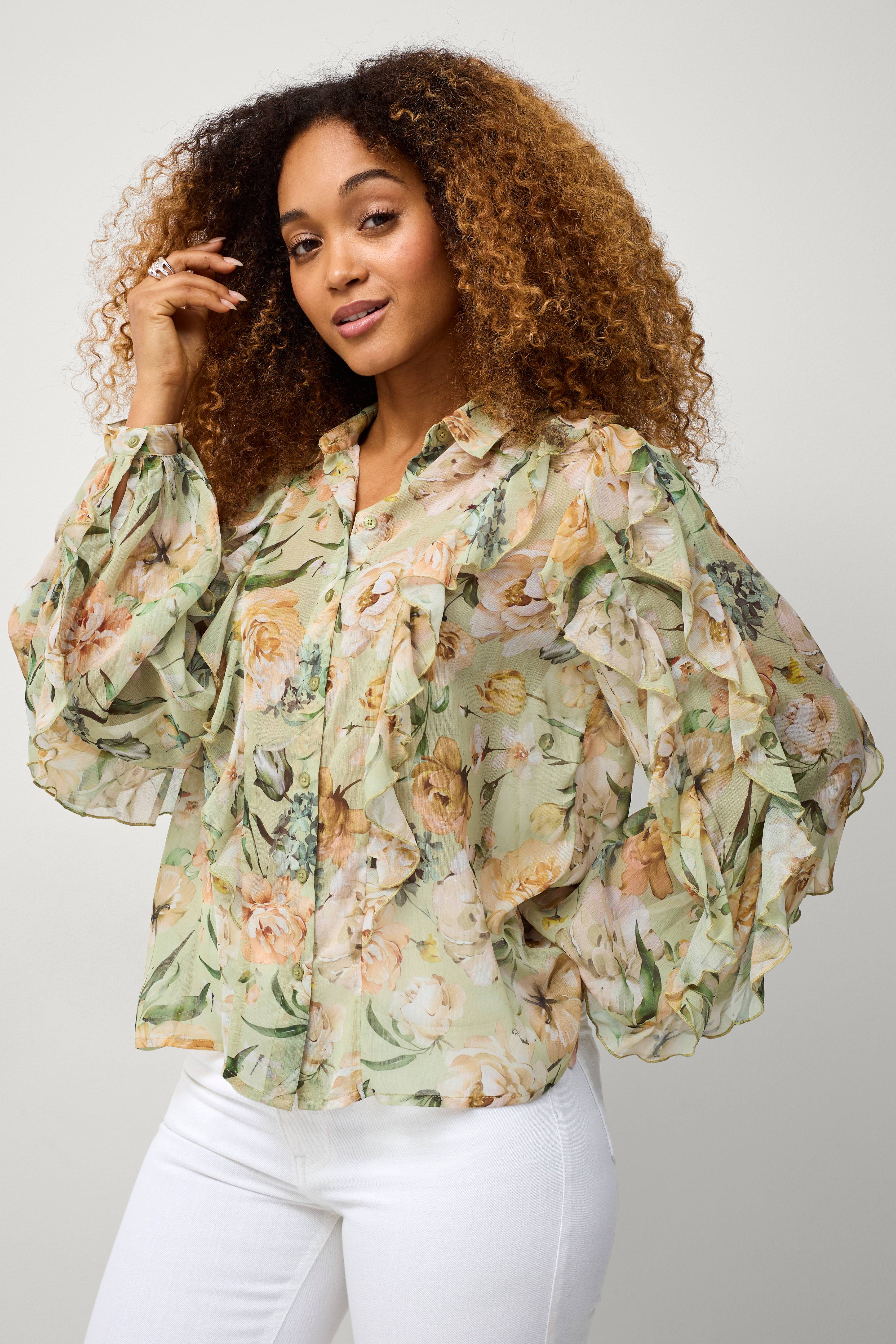 En väldigt fin blus, vackra färger. Ser både skir och festlig ut med volangerna. Är mycket nöjd!