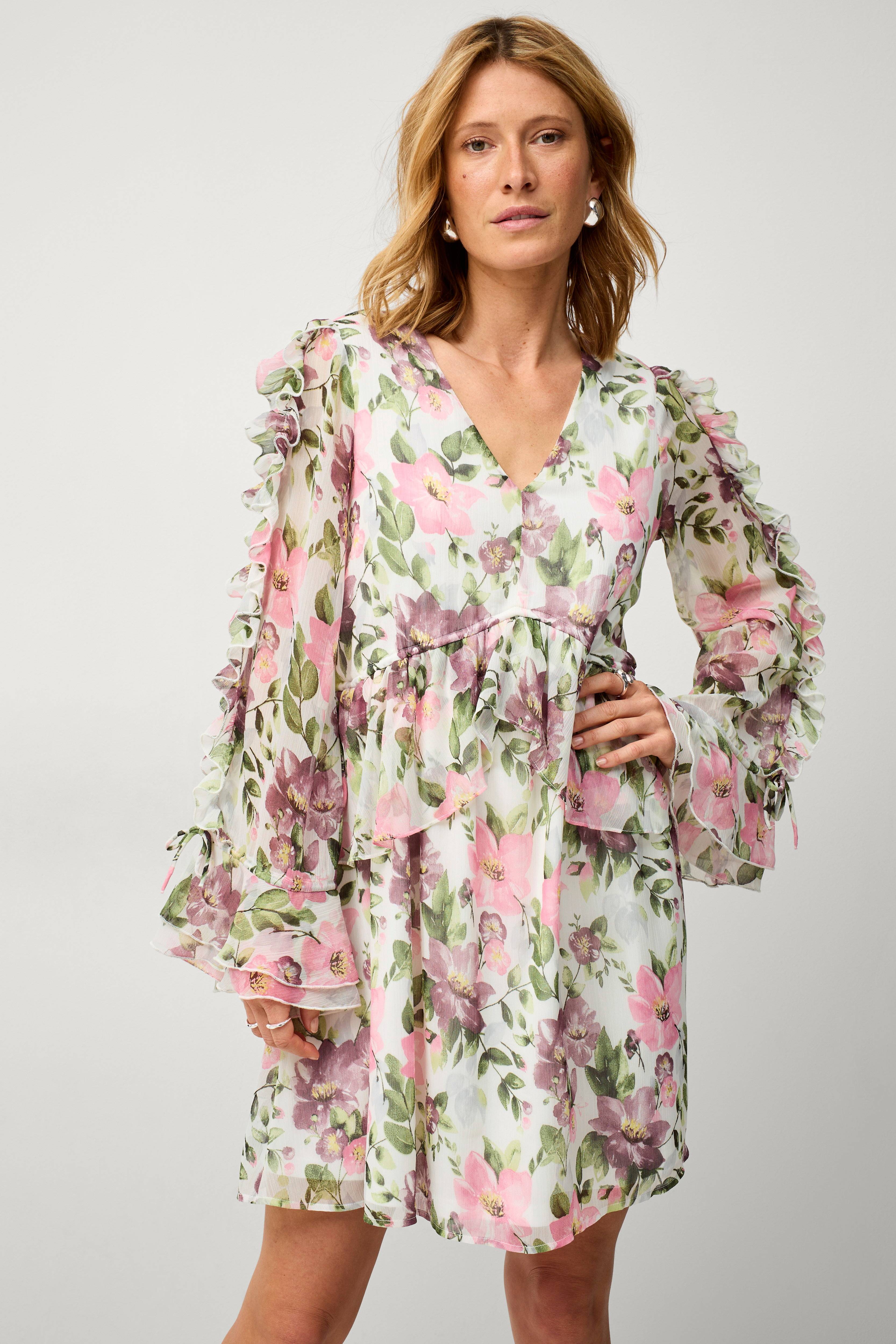 • Klänning i chiffong• V-ringning• Markerad midja med dragsko och volang• Vida ärmar med volanger• Trikåfoder• Längd: 92 cm i storlek 34/36
