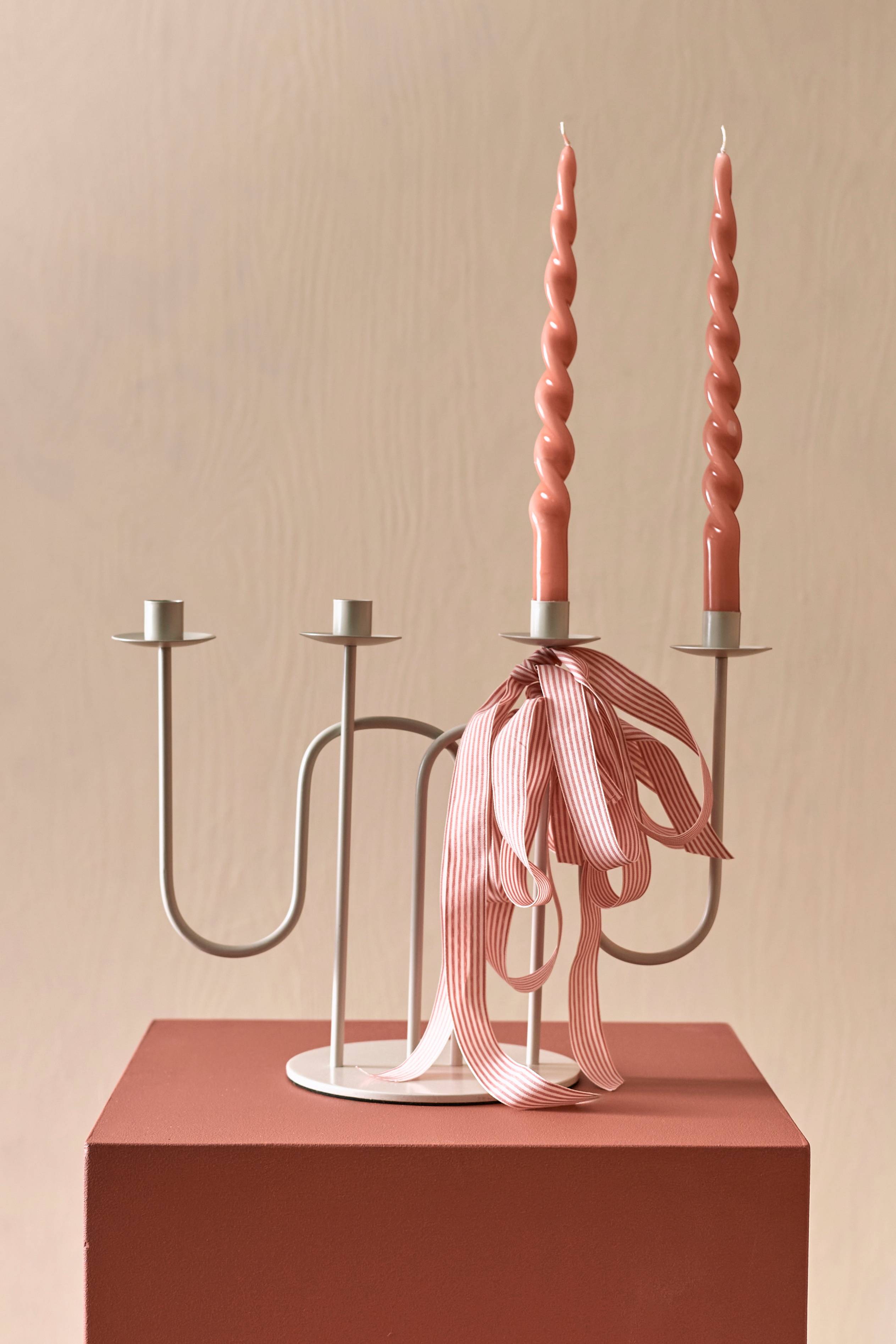 4-armad adventsljusstake av pulverlackad metall. Bottenplattan är textilklädd på undersidan.