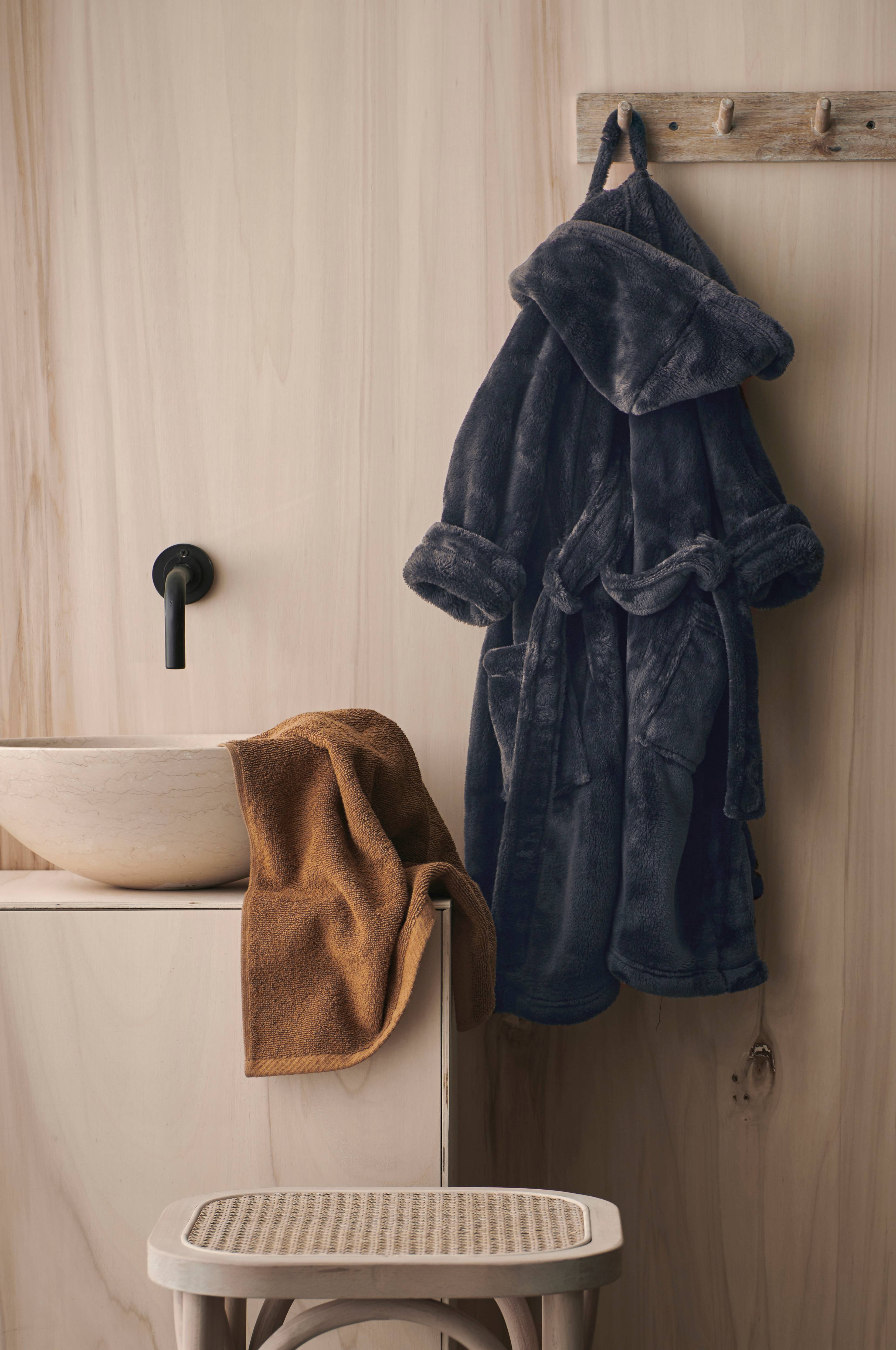 Badrock av mjuk, fluffig microfleece i extra tjock kvalitet. Knytskärp och två fickor.