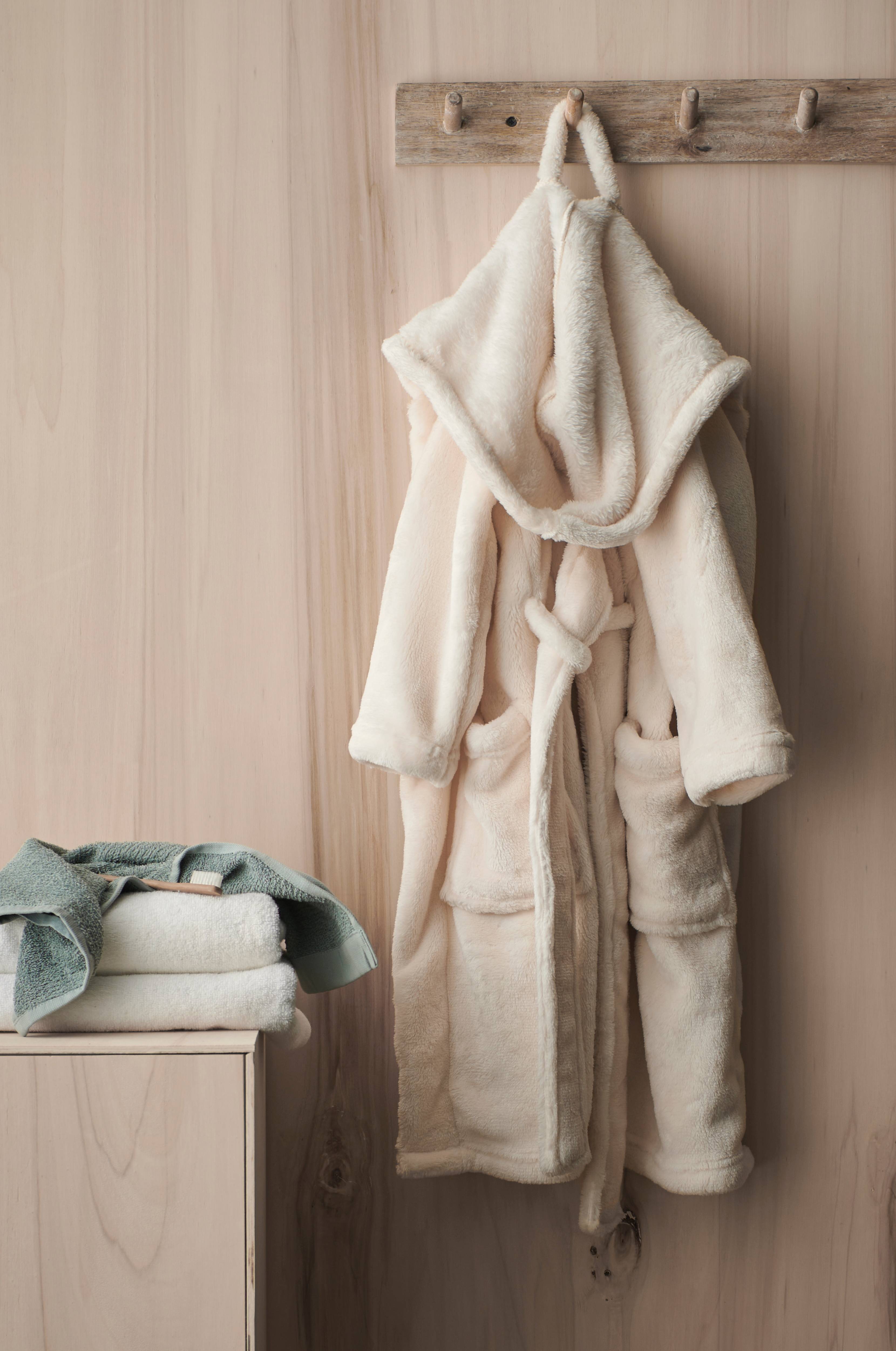 Badrock av mjuk, fluffig microfleece i extra tjock kvalitet. Knytskärp och två fickor.