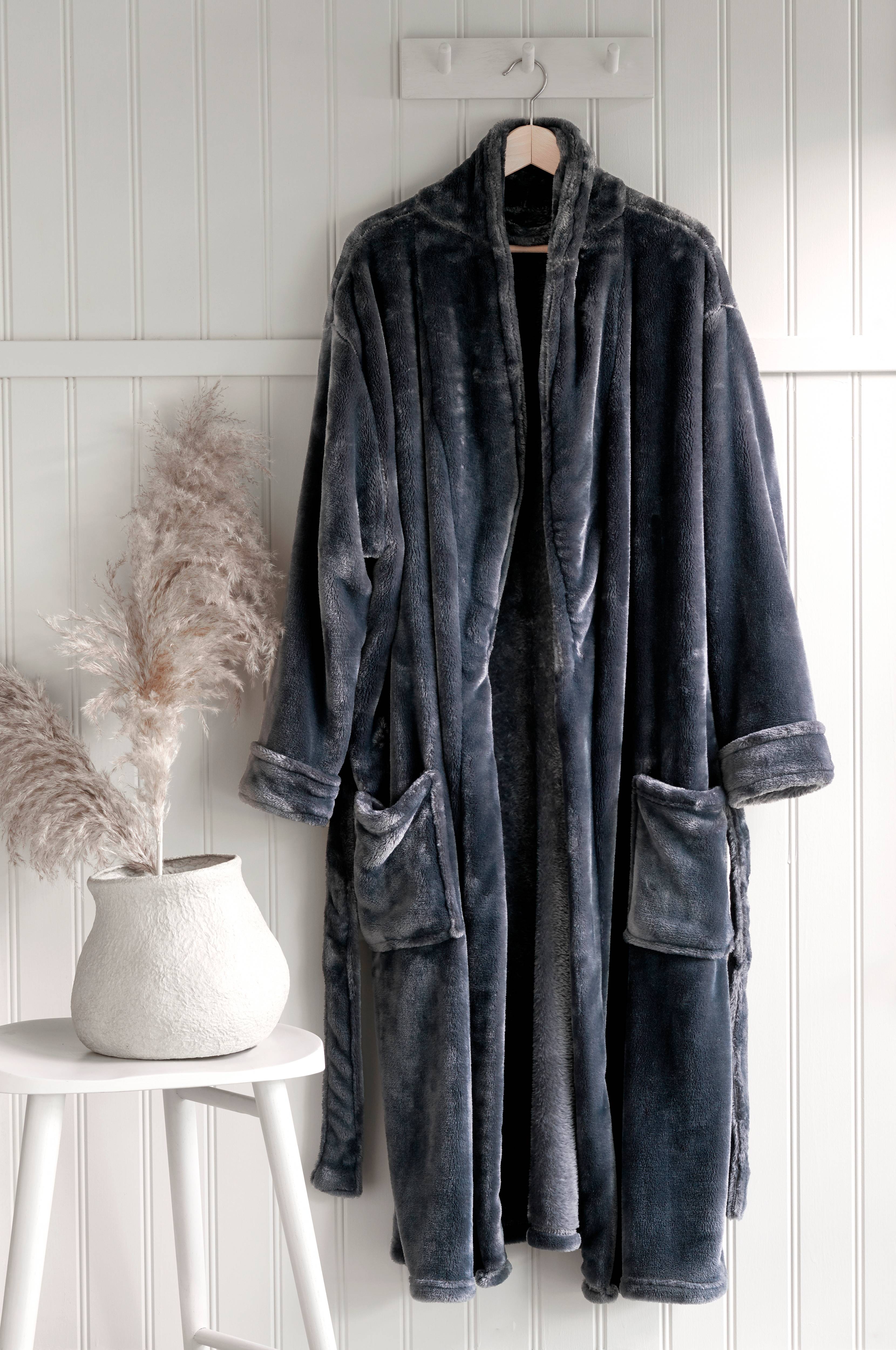Badrock av mjuk, fluffig microfleece i extra tjock kvalitet. Knytskärp och två fickor. Längd ca 128 cm i stl M.