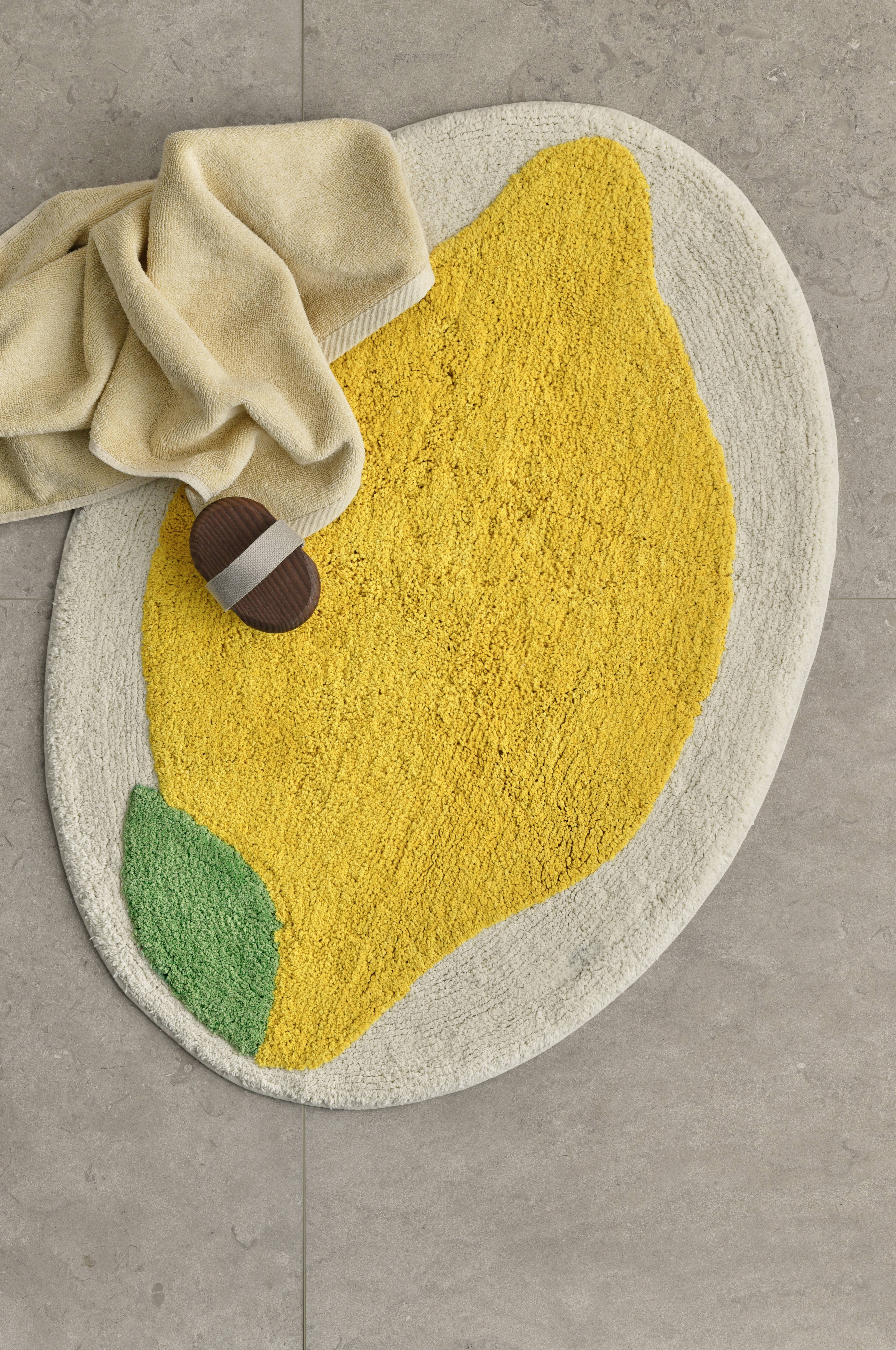 Tuftad, mjuk badrumsmatta i form av en citron. Av bomull. Halkfri baksida med latexbehandling.