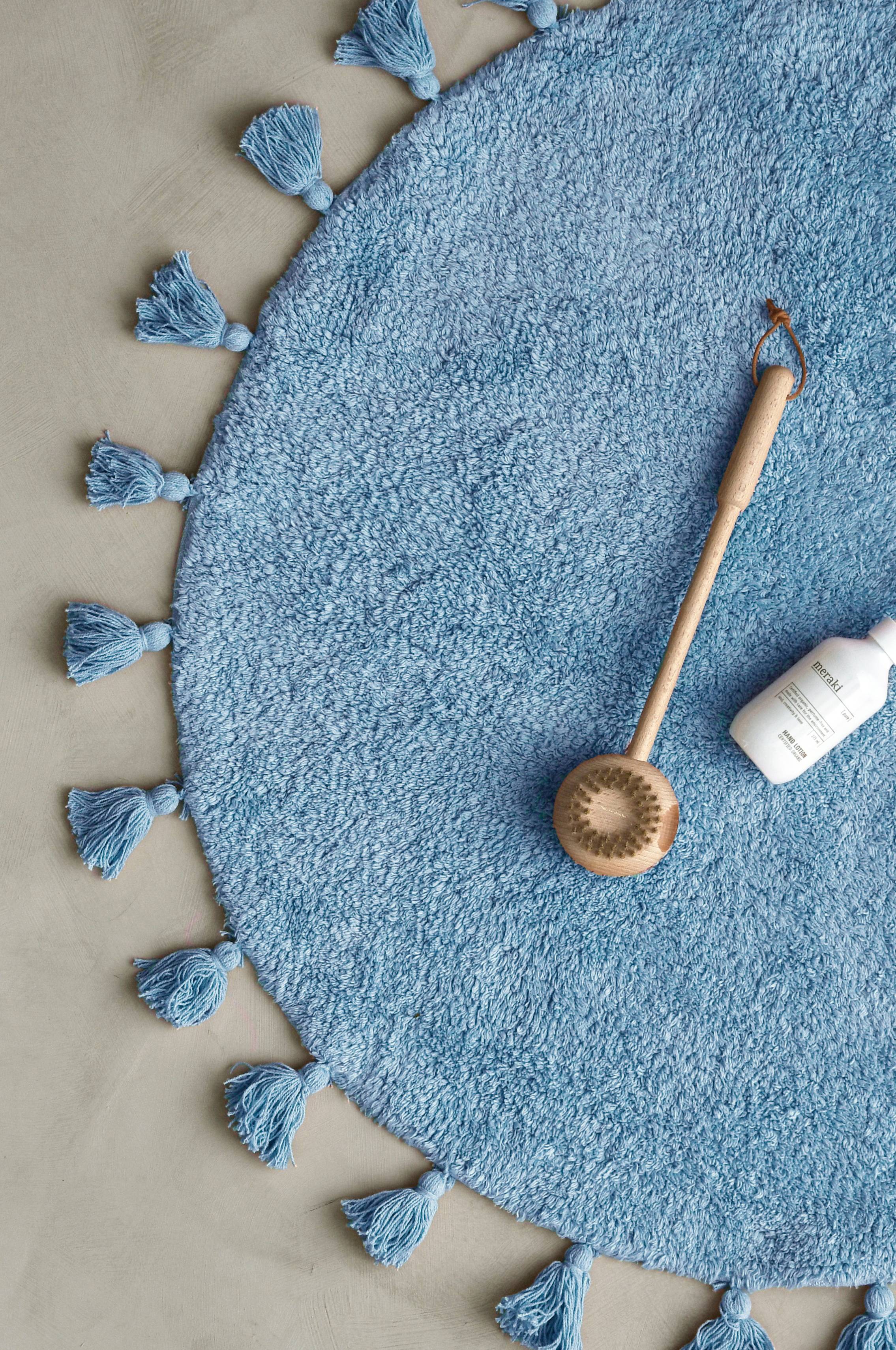 Rund, tuftad badrumsmatta i bomull med tofsar runt om.