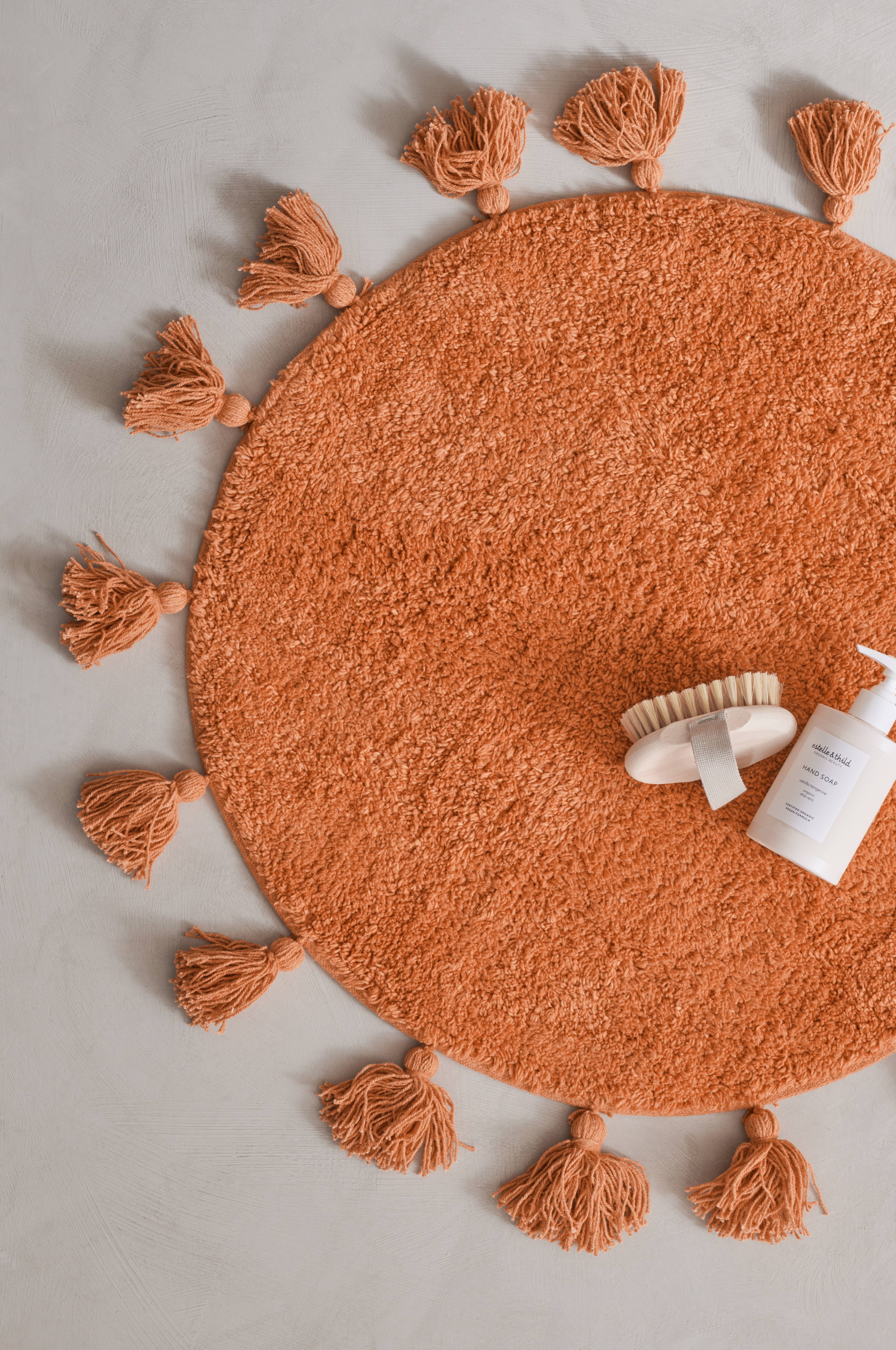 Rund, tuftad badrumsmatta i bomull med tofsar runt om.