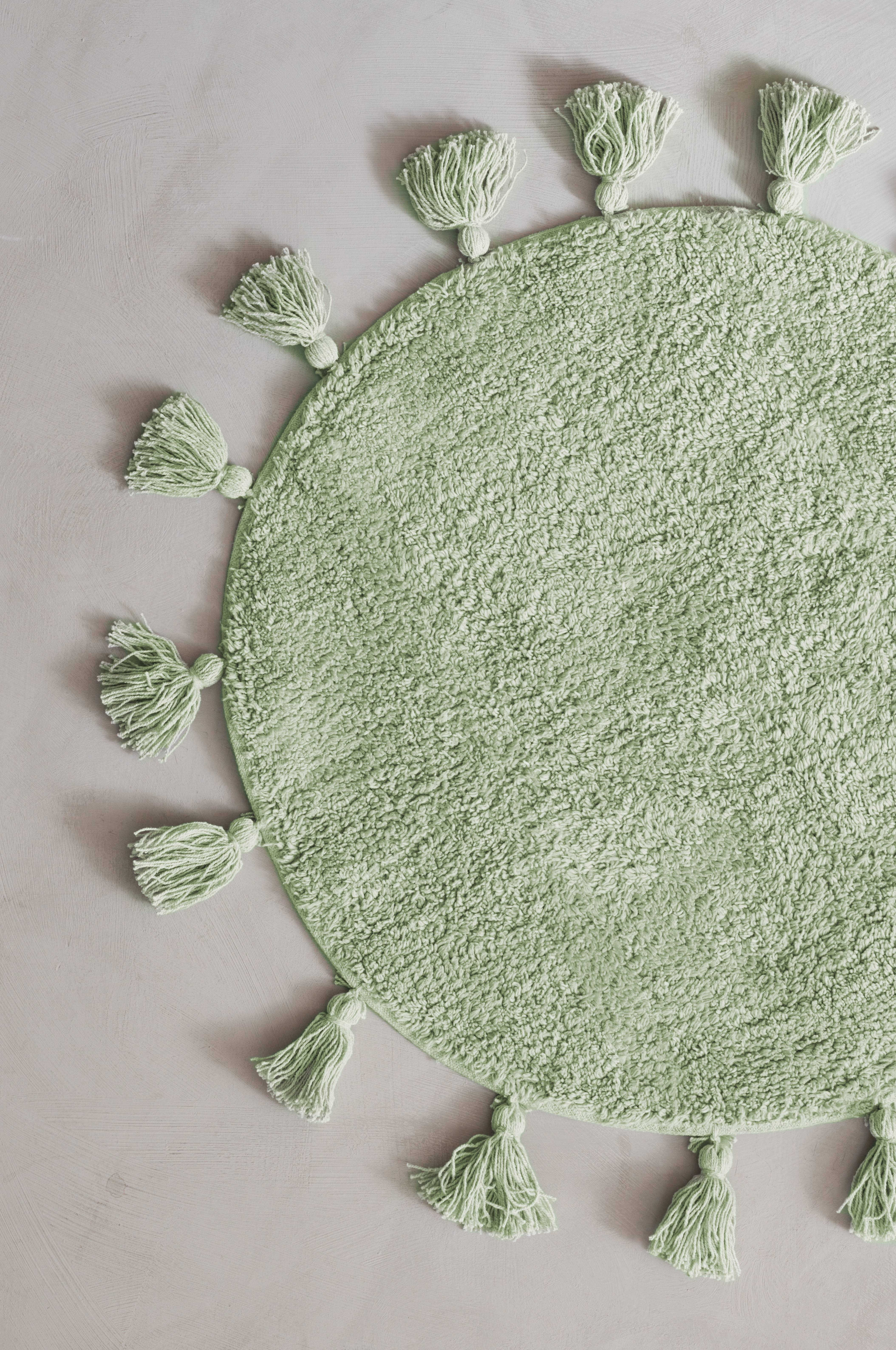 Rund, tuftad badrumsmatta i bomull med tofsar runt om.