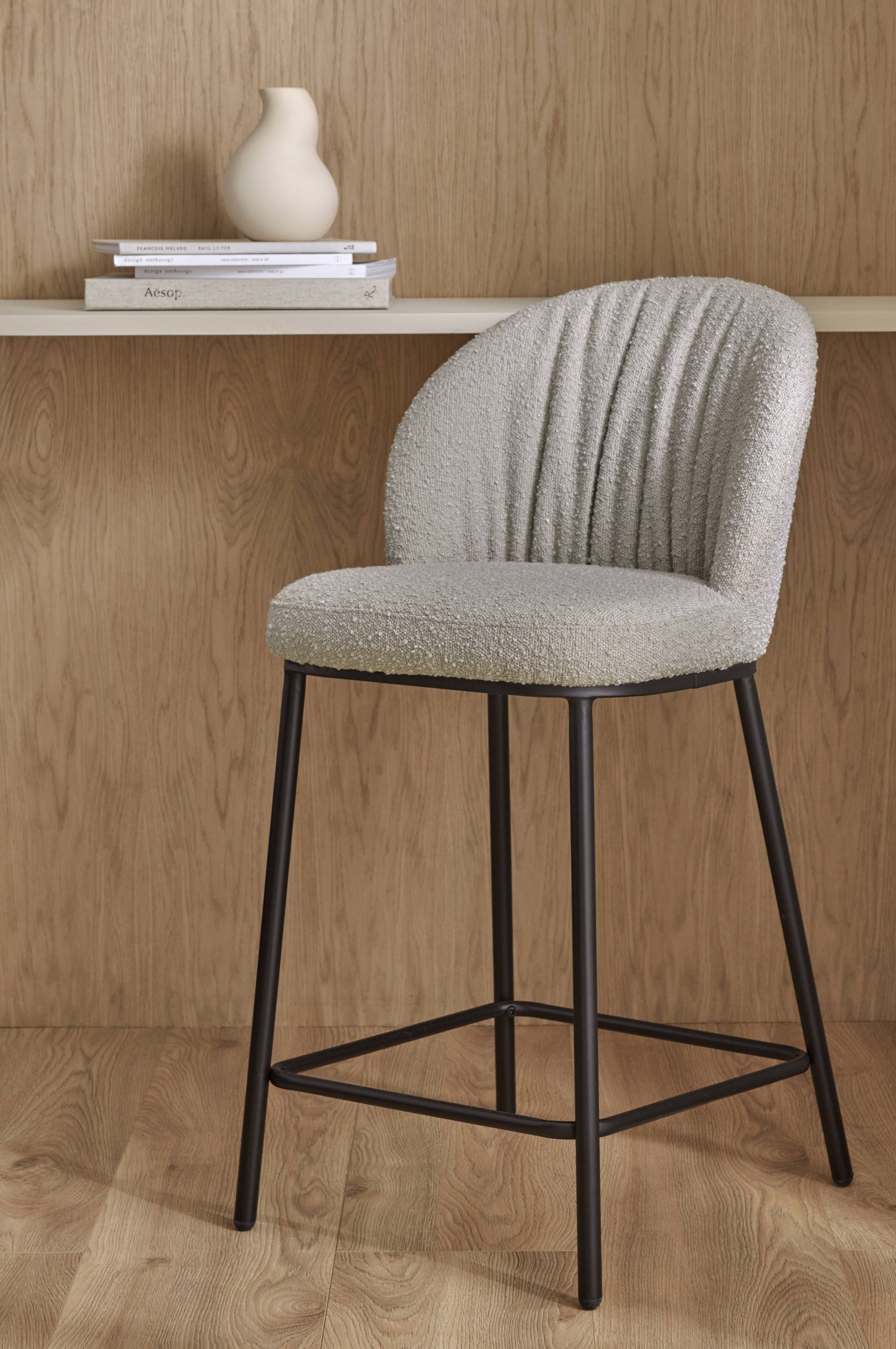 Barstol med ben och stomme i pulverlackad metall. Klädsel i bouclé med rynkat tyg på insidan av ryggstödet. Skumfyllning. Max vikt 150 kg. Ryggstödets höjd 31 cm. Säljs i 1-styck.