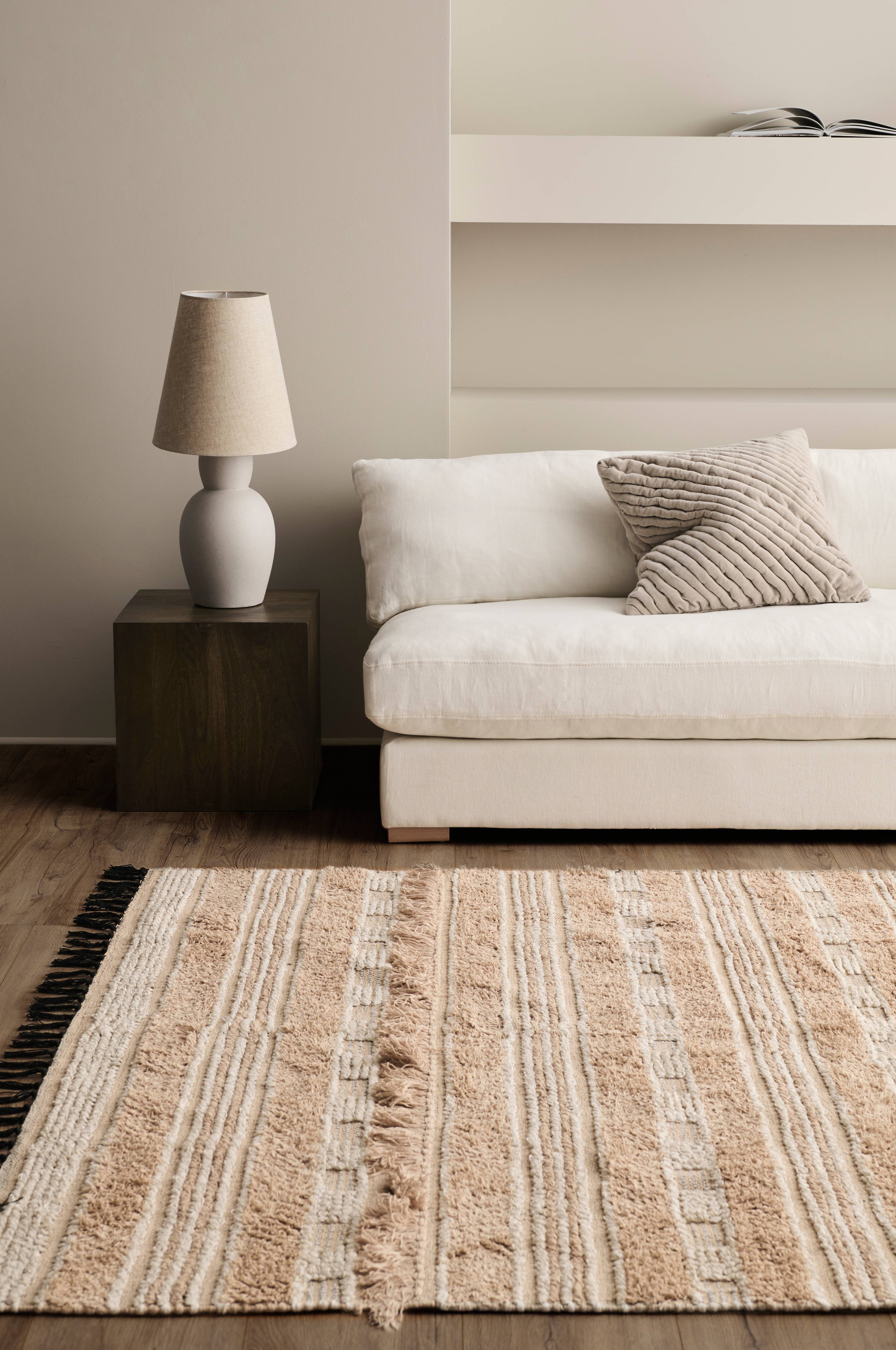 Handvävd bomullsmatta med tuftade och strukturvävda detaljer med fransar och mönster i olika höjder. Fransar i kortändarna.