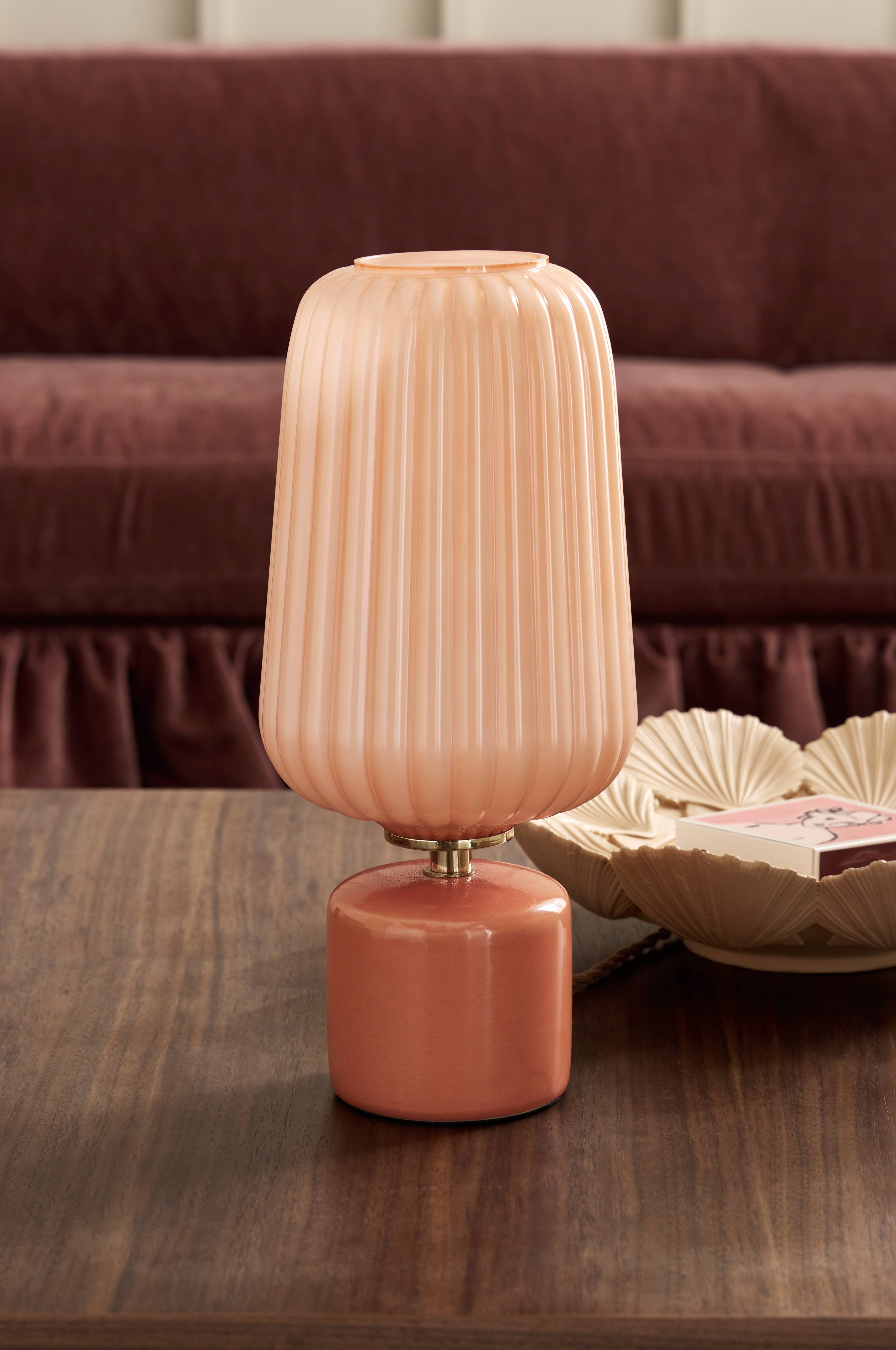 Bordslampa med fot i keramik och veckad skärm av frostat glas. Skärmen skruvas fast på foten. Total höjd 40 cm, Ø 18 cm. Skärmens mått: Höjd 27 cm, Ø 18 cm. Lampfotens mått: Ø 12 cm, höjd 11 cm. Svart textilsladd med strömbrytare, sladdlängd 180 cm. Sockel E27. Max 25 W. Ljuskälla ingår ej.