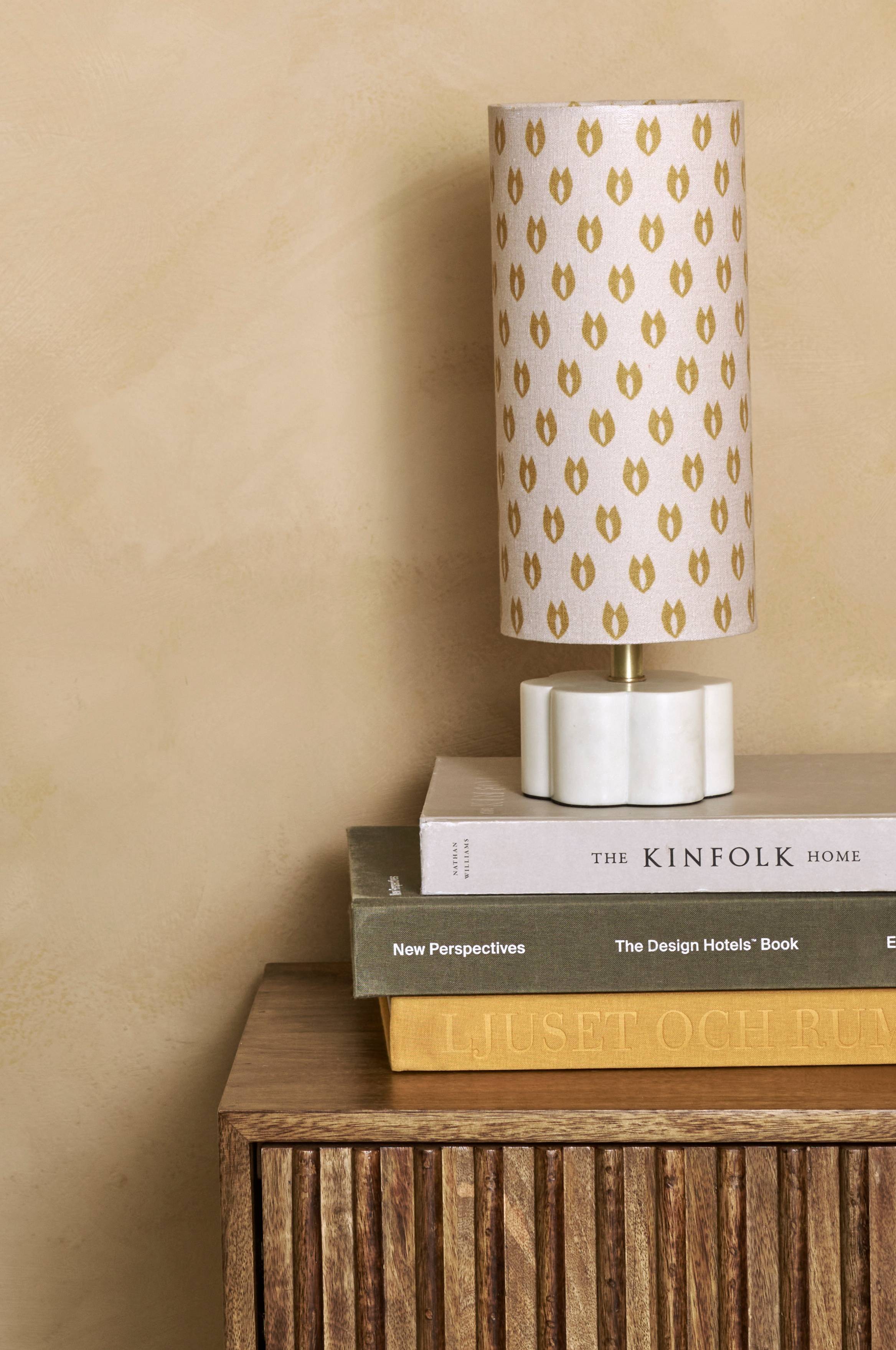 Bordslampa med fot av marmor och skärm av textil. Plastsladd med strömbrytare. Mått på skärmen: Diameter 12 cm, höjd 25 cm. Mått på lampfoten: Diameter 10 cm, höjd 13,5 cm. Ljuskälla ingår ej.