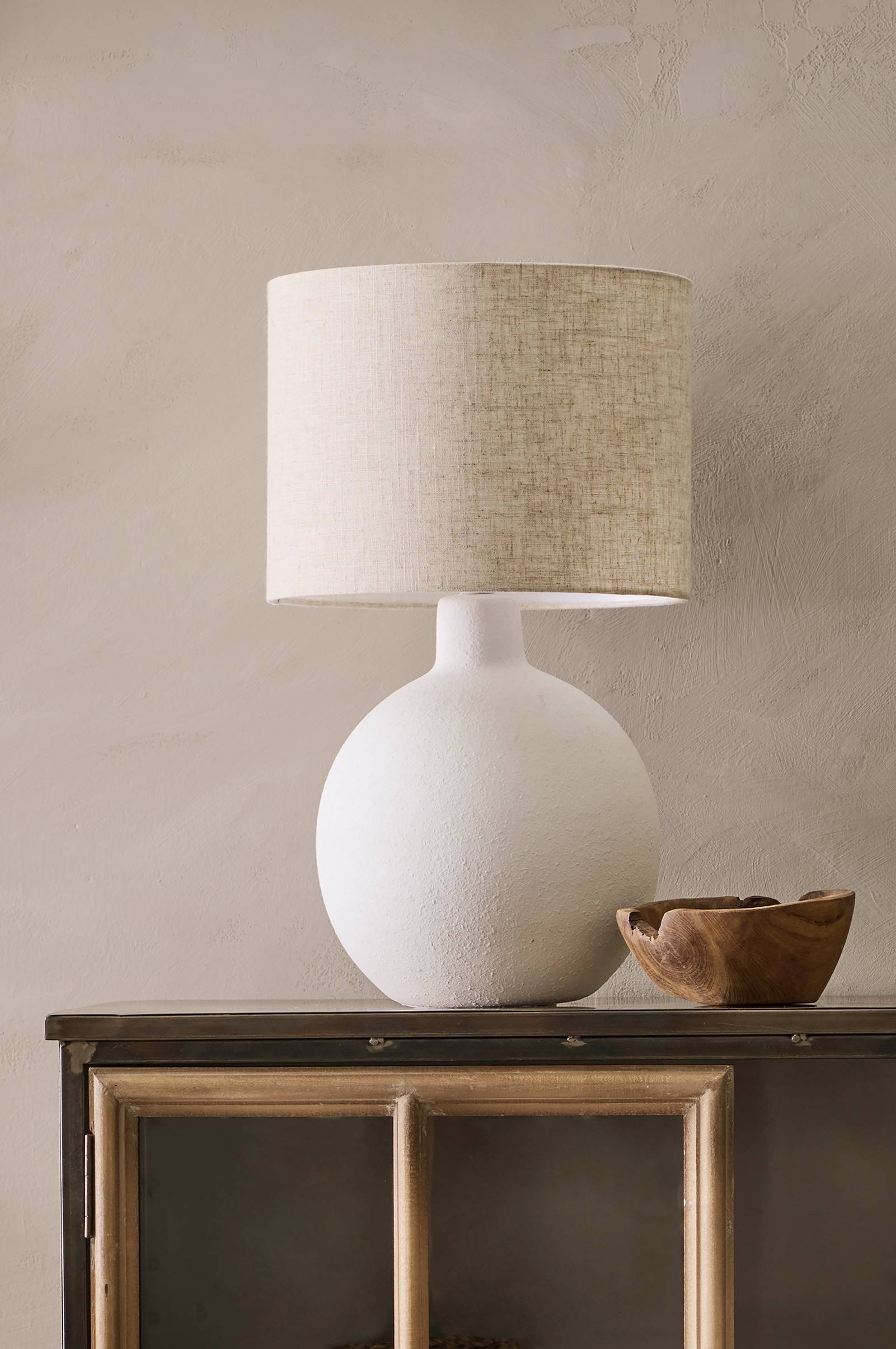 Bordslampa med fot i stengods med lätt struktur. Skärm i linnetyg. Total höjd 56 cm. Mått på skärmen: Diameter 32 cm, höjd 24,5 cm. Mått på lampfoten: Höjd 37 cm, diameter som störst 26 cm. Diameter botten 14,5 cm. Vit textilsladd med strömbrytare, sladdlängd 180 cm. Sockel E27. Max 25W. Ljuskälla ingår ej.
