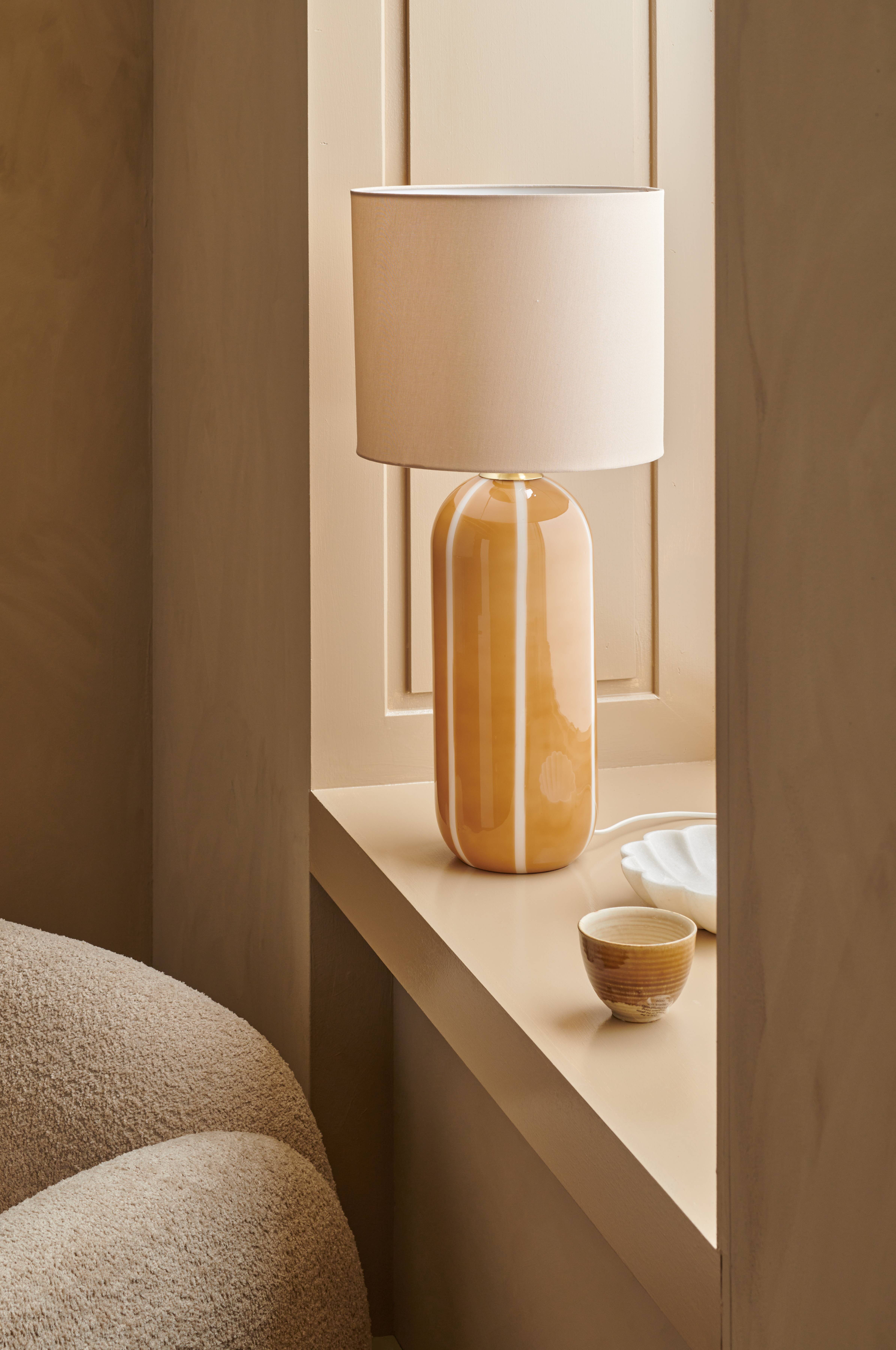 Bordslampa med fot av randfärgat glas och cylinderformad textilskärm i linnetyg.Skärmens mått: Höjd 26 cm. diameter 28 cm.Lampfotens mått: Höjd 38 cm, diameter 15 cm.Vit sladd med strömbrytare. Ljuskälla ingår ej.