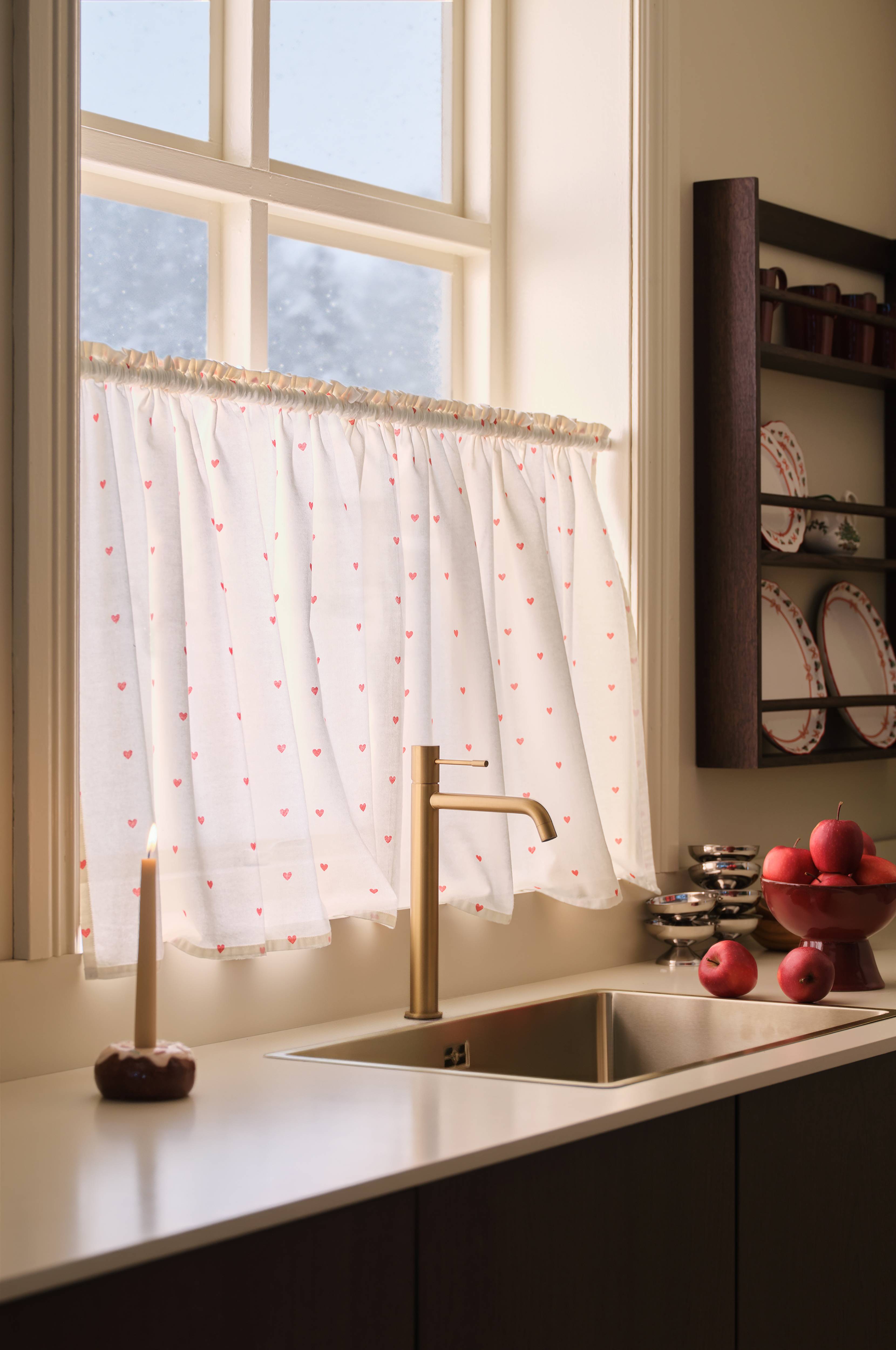 • Cafégardin i något kraftigare halvpanama med tryckt hjärtmönster• 3 cm kanal upptill• Perfekt som insynsskydd• Tips: En smalare gardinstång eller gardinspiral kan användas