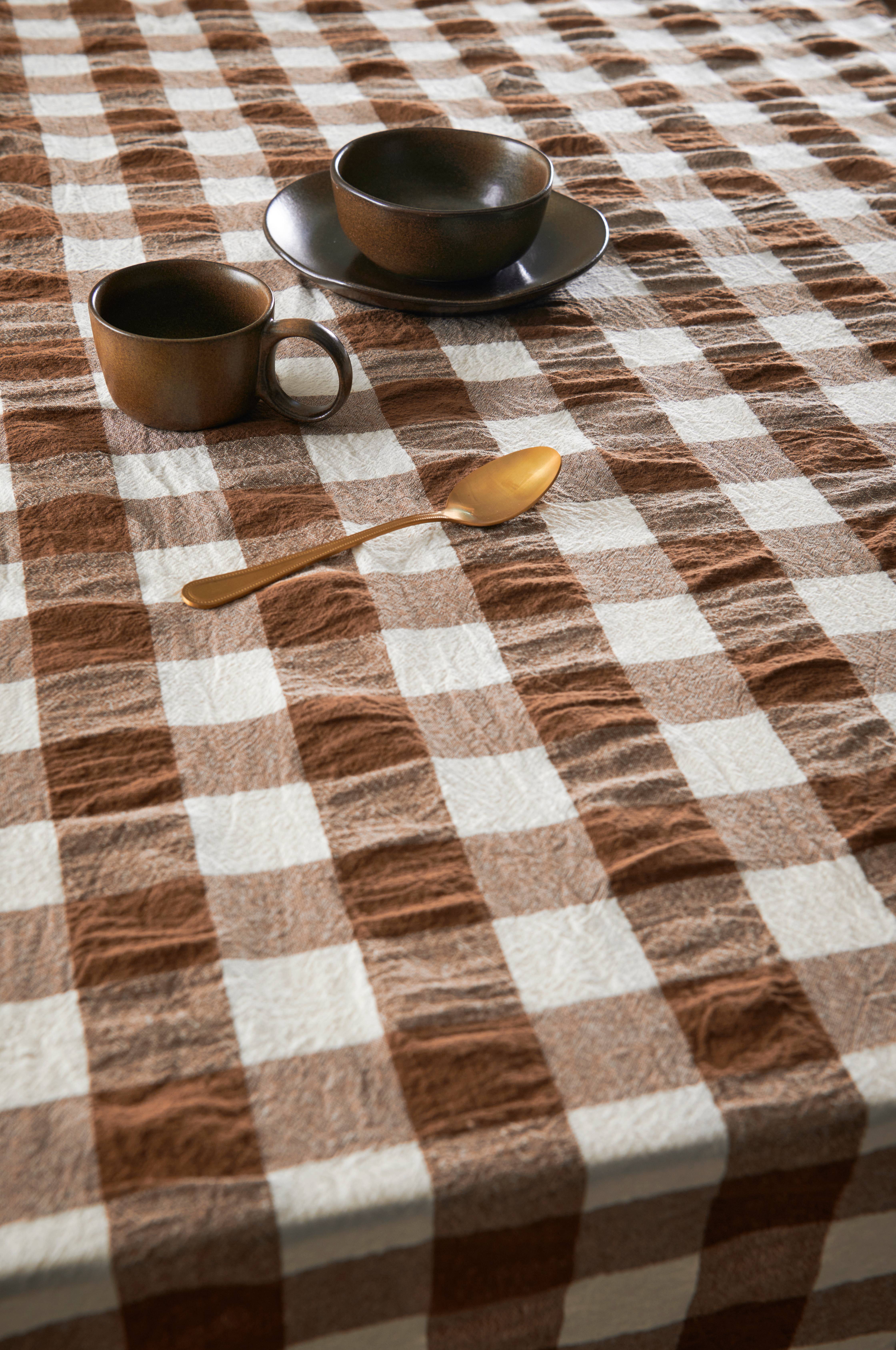 Rutig duk i seersucker (bäckebölja) med struktur i tyget. Garnfärgade rutor. ekologisk bomull i tvättad kvalitet.