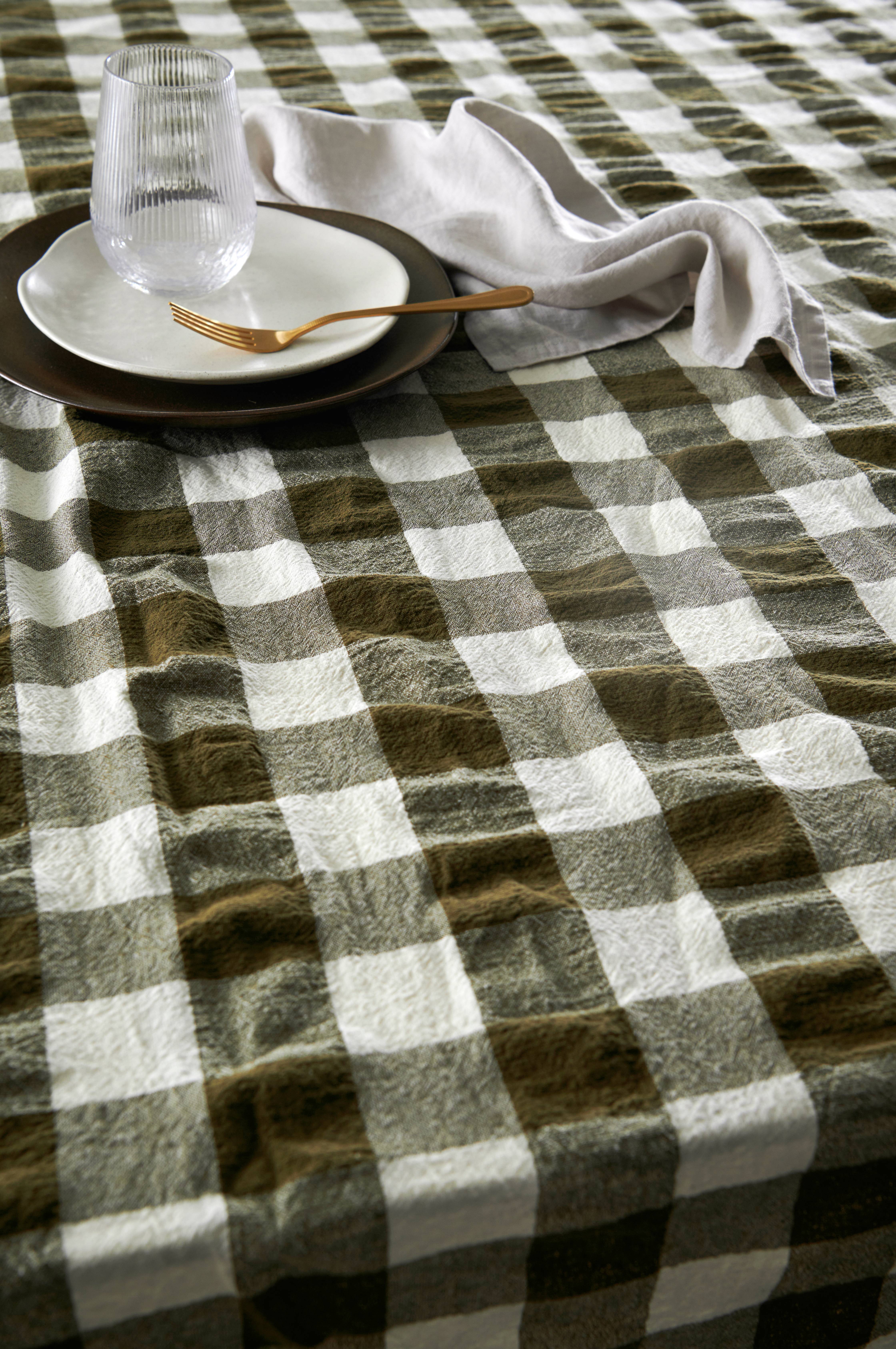 Rutig duk i seersucker (bäckebölja) med struktur i tyget. Garnfärgade rutor. ekologisk bomull i tvättad kvalitet.
