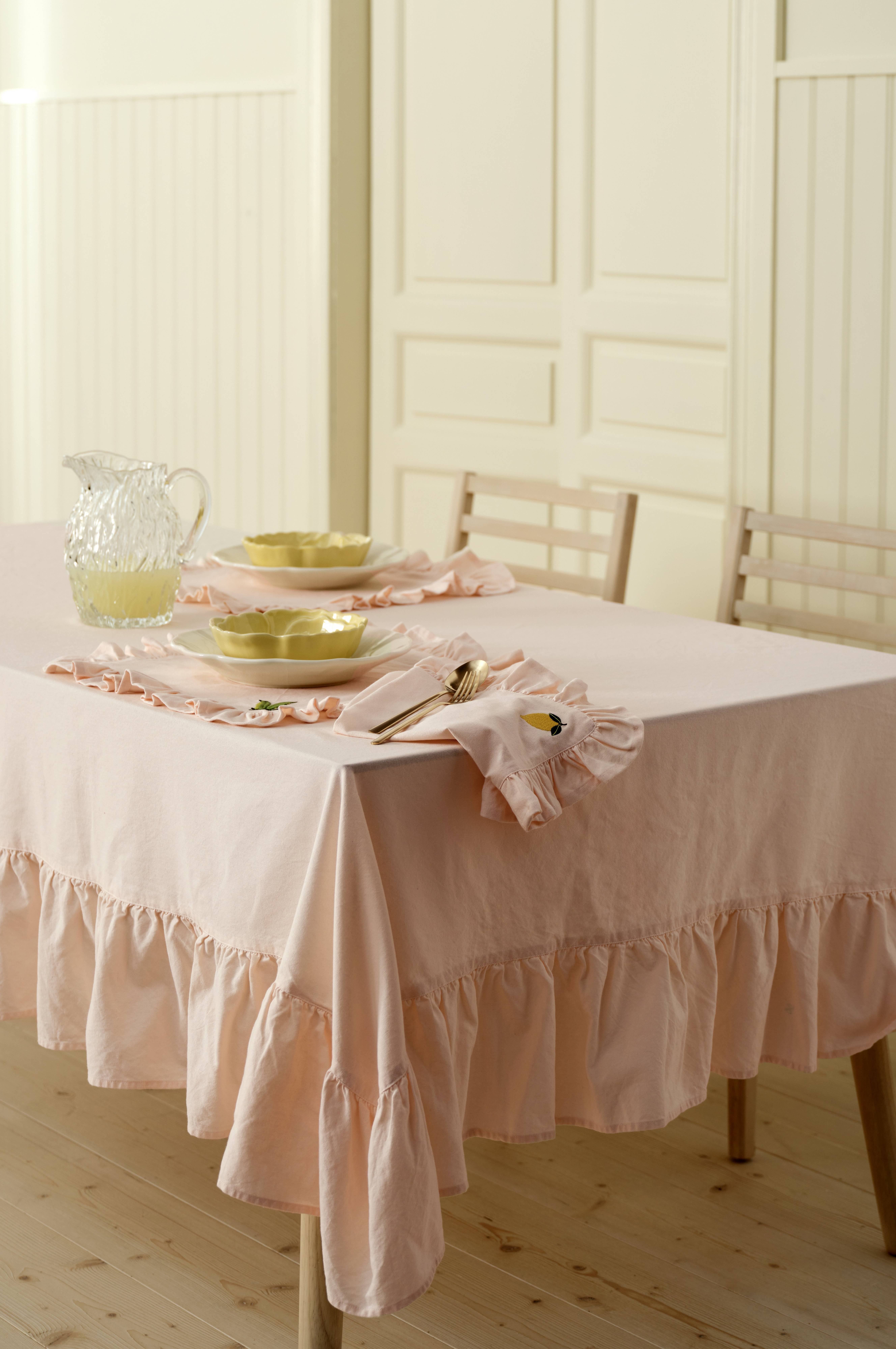 • Enfärgad duk i bomull• 20 cm volang runt om