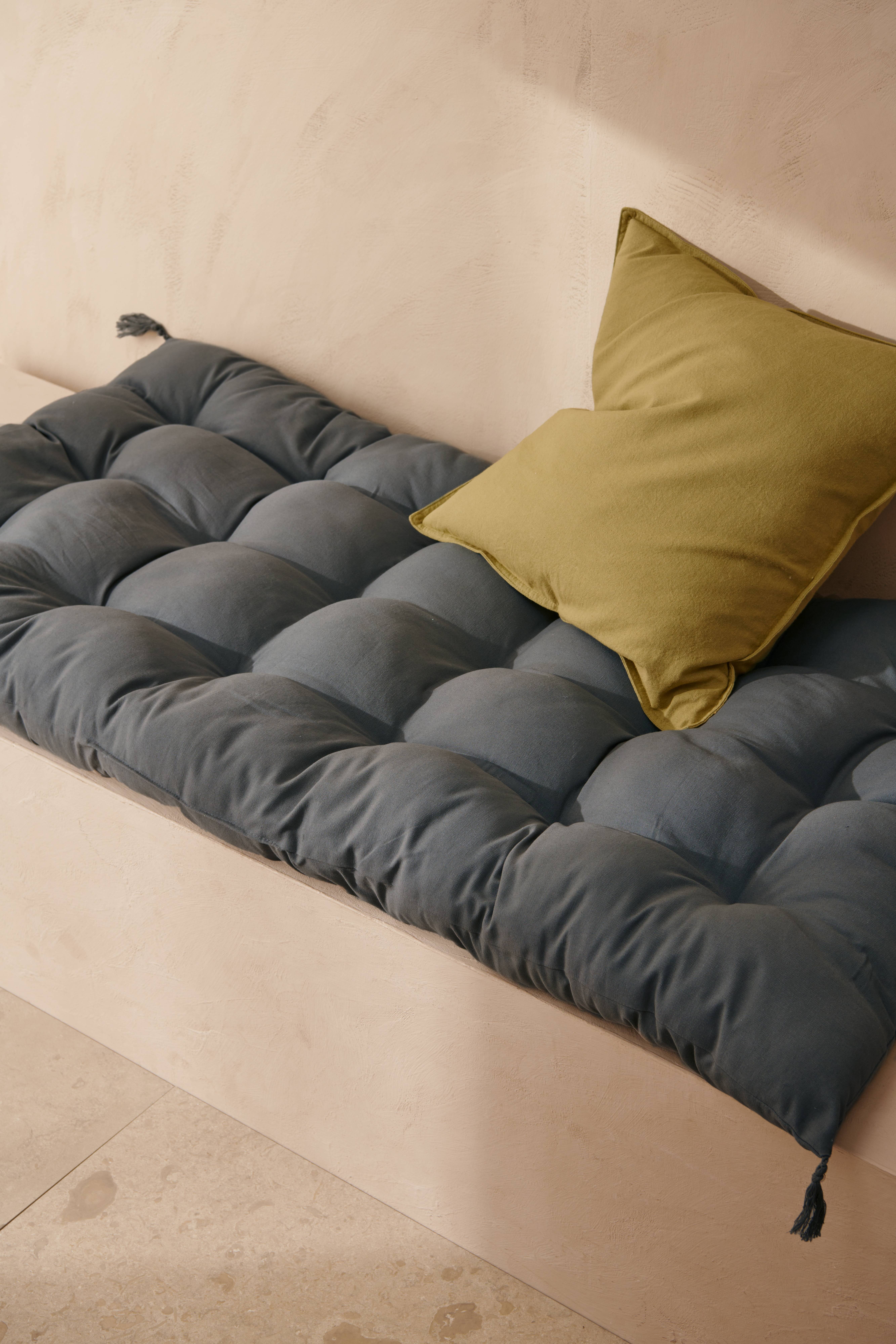 Dyna / madrass i bomull med dekorativa stygn och bomullstofsar i hörnen. Fyllning av återvunnen polyester. Tjocklek 5 cm.