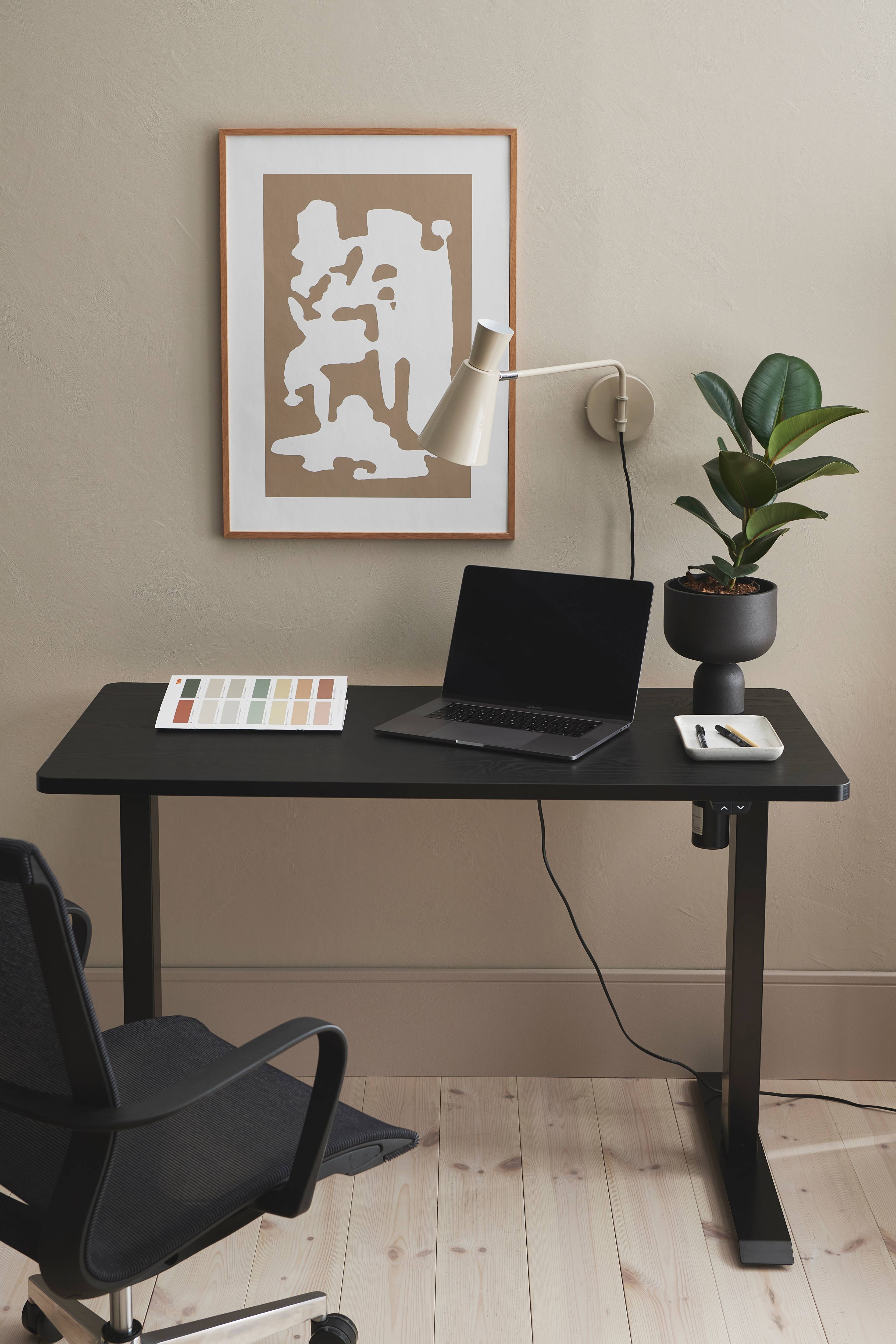 Höj- och sänkbart skrivbord med toppskiva i 3D-melamin och pulverlackade ben i metall. Höjd 71-121 cm, bredd 60 cm, längd 120 cm. Sladdens längd är 2 m. Montering.