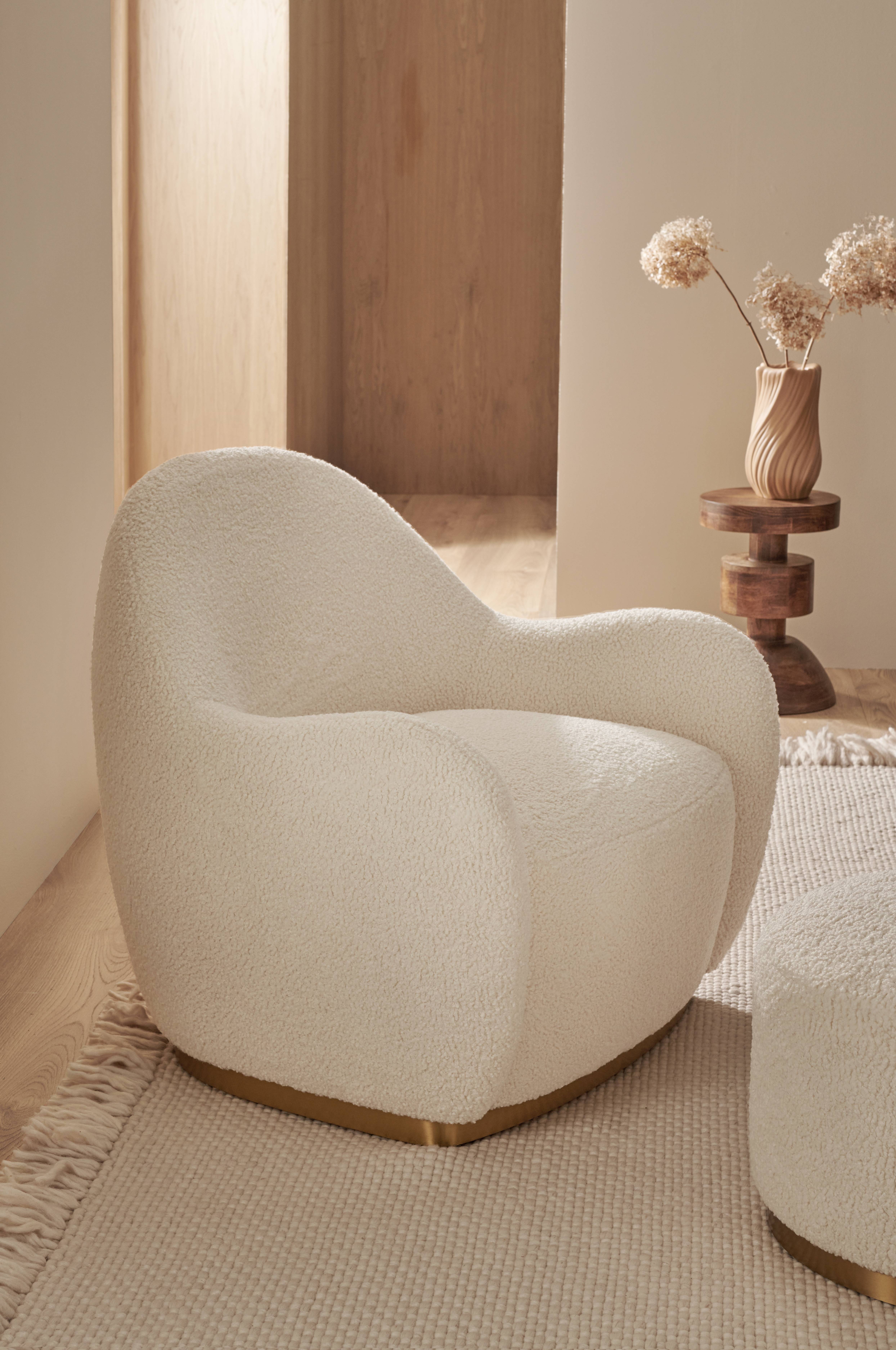 Fåtölj med klädsel i mjuk teddy. Stomme: Massivt trä och plywood. Skumfyllning. Ben av metall. Max viktbelastning 100 kg. Höjd till armstöd 57 cm.