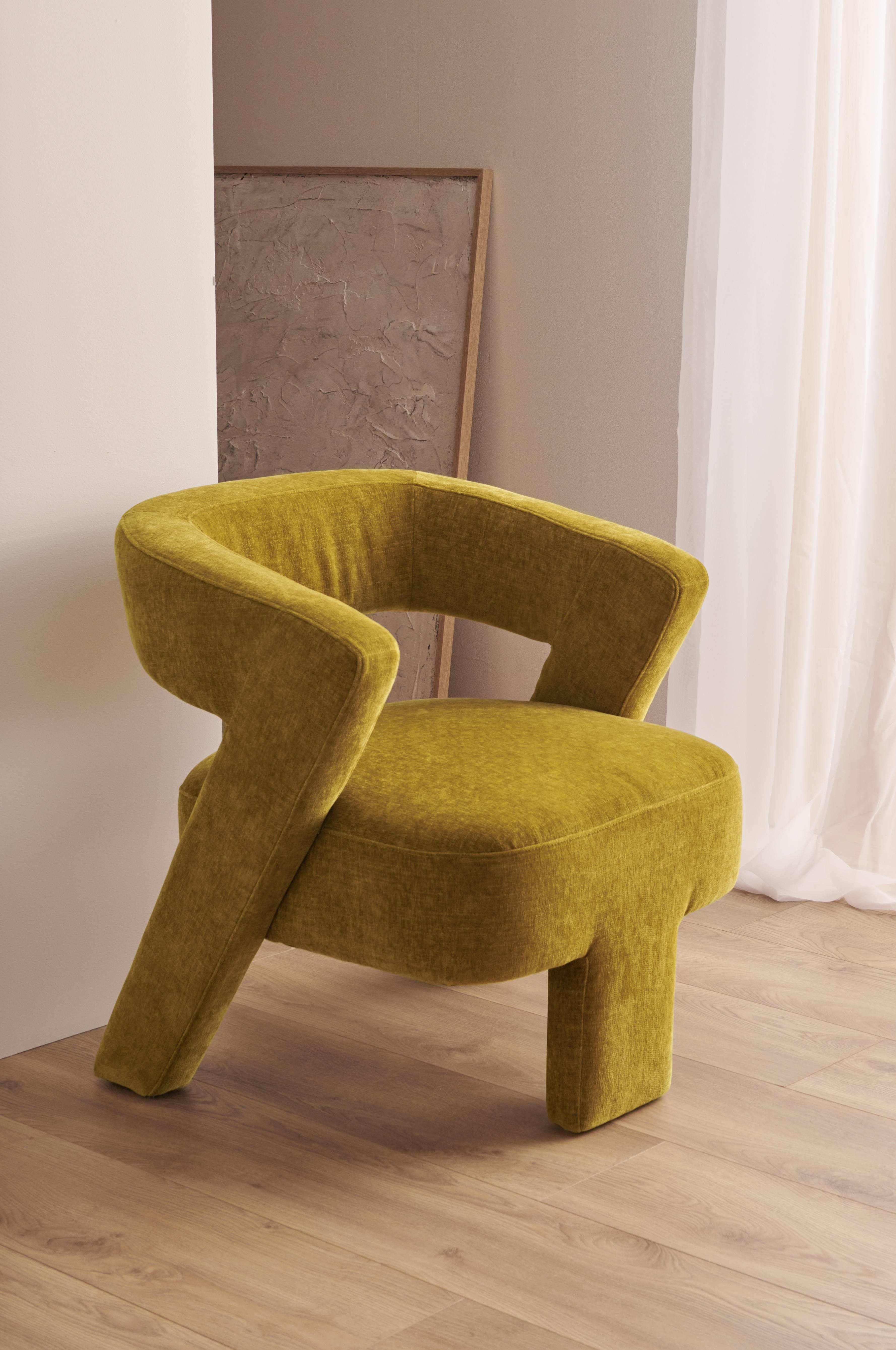 Fåtölj i modern, trendig design med utanpåliggande ben. Klädsel i tvättad sammet av polyester. Stomme i massiv furu och plywood. Nozagfjädring och skumfyllning.