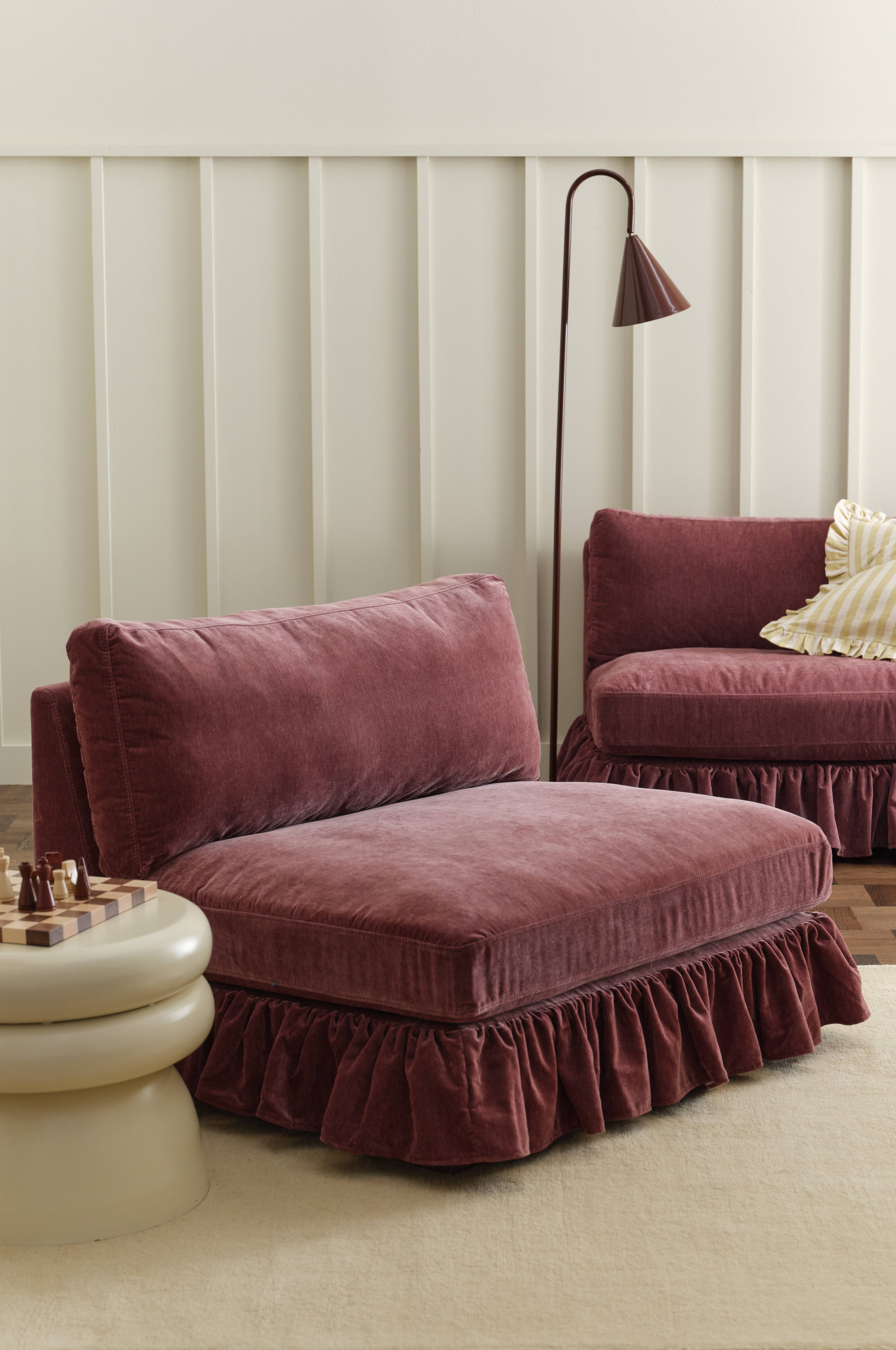 • Klädsel i lätt glansig chenille• Vändbara dynor• Dekorativ volangkant nedtill• Stomme i plywood och massiv furu• Ben i bok• Skumfyllning• Nozagfjädring• Polyesterfiber (Dacron) i rygg- och sittkudden för extra komfort