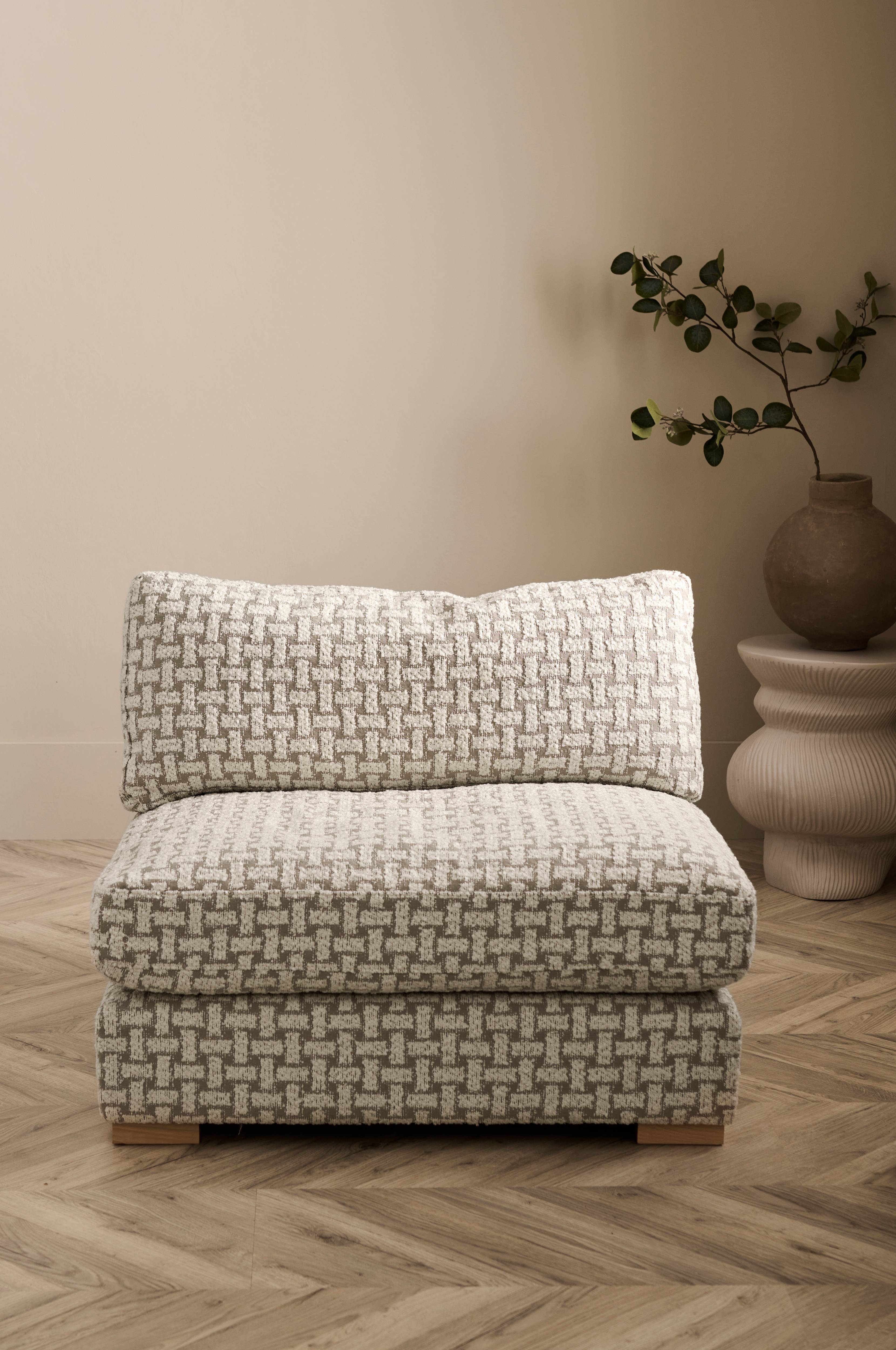 Fåtölj i modern design med stomme i furu och plywood. Skumfyllning i sittdynan samt fiber- och fjäderfyllning i ryggdynan för extra komfort. Mönstrad klädsel av 90% polyester och 10% bomull. Avtagbar klädsel på dynorna. Frihöjd under möbel 3 cm.