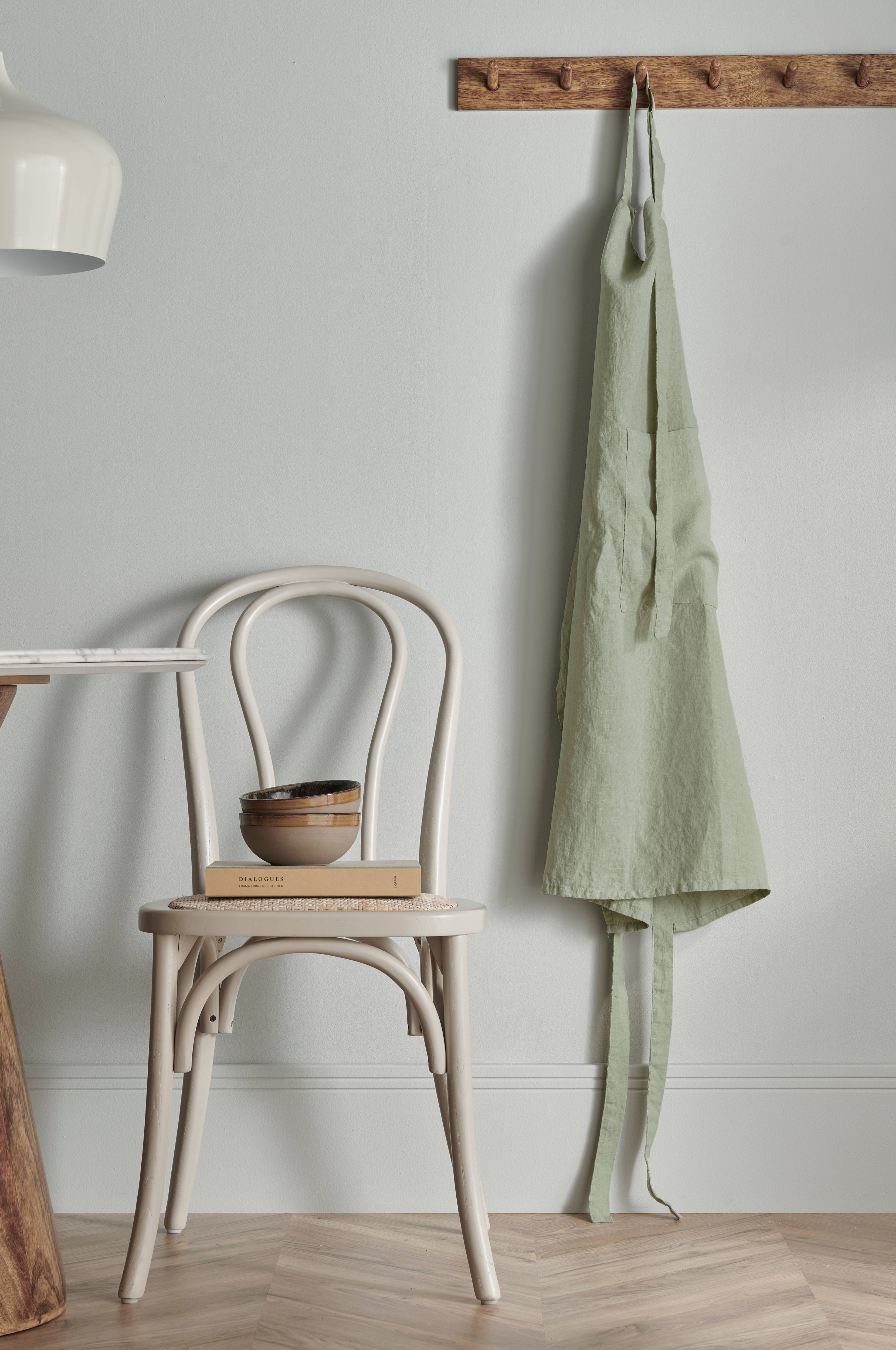 Förkläde av 100% franskt lin i tvättad kvalitet. Ett klassiskt, vackert material med sval och mjuk känsla. Justerbart nackband med mässingsfärgat metallspänne. Påsytt knytskärp. Längd 95 cm.