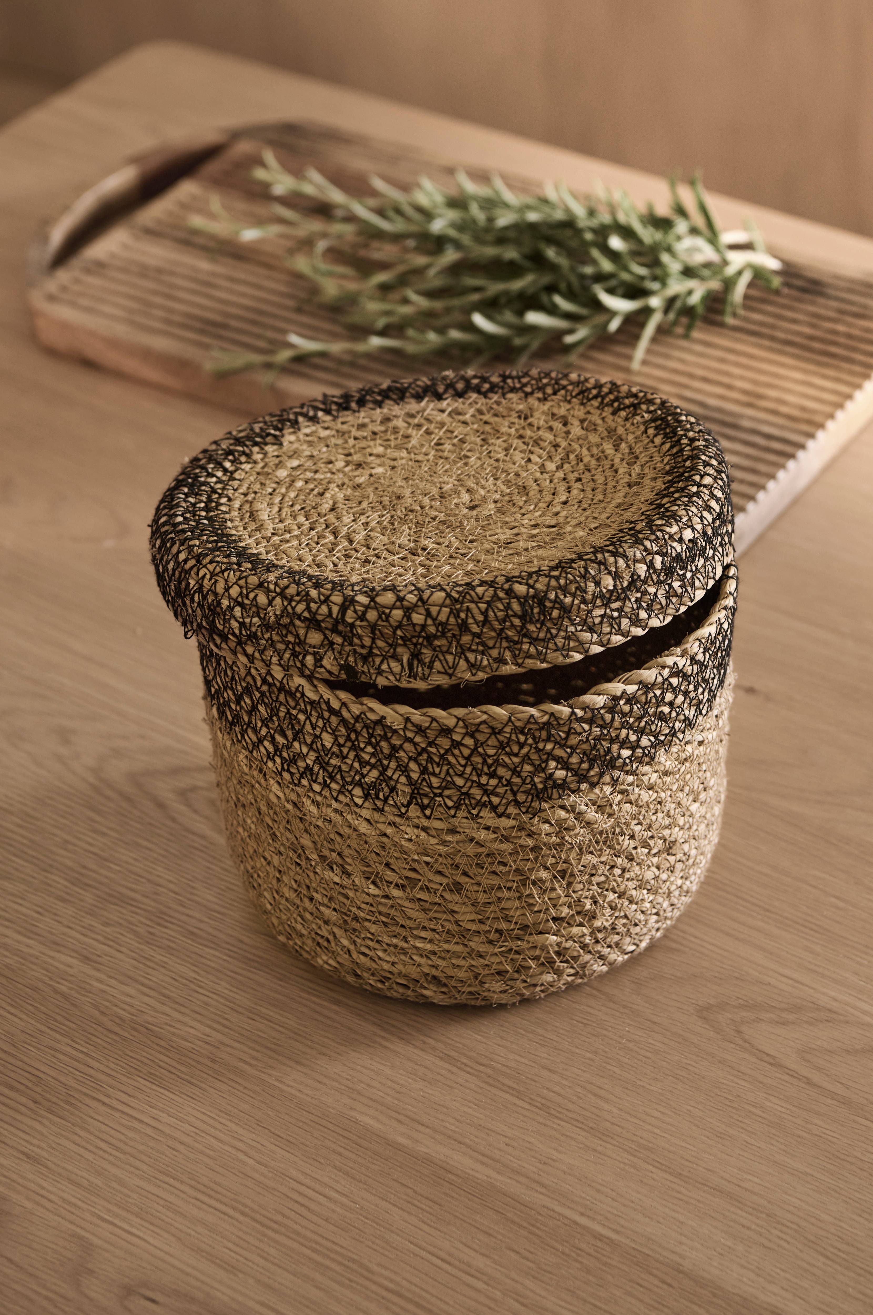 Förvaringskorg med lock. Tillverkad av sjögräs.