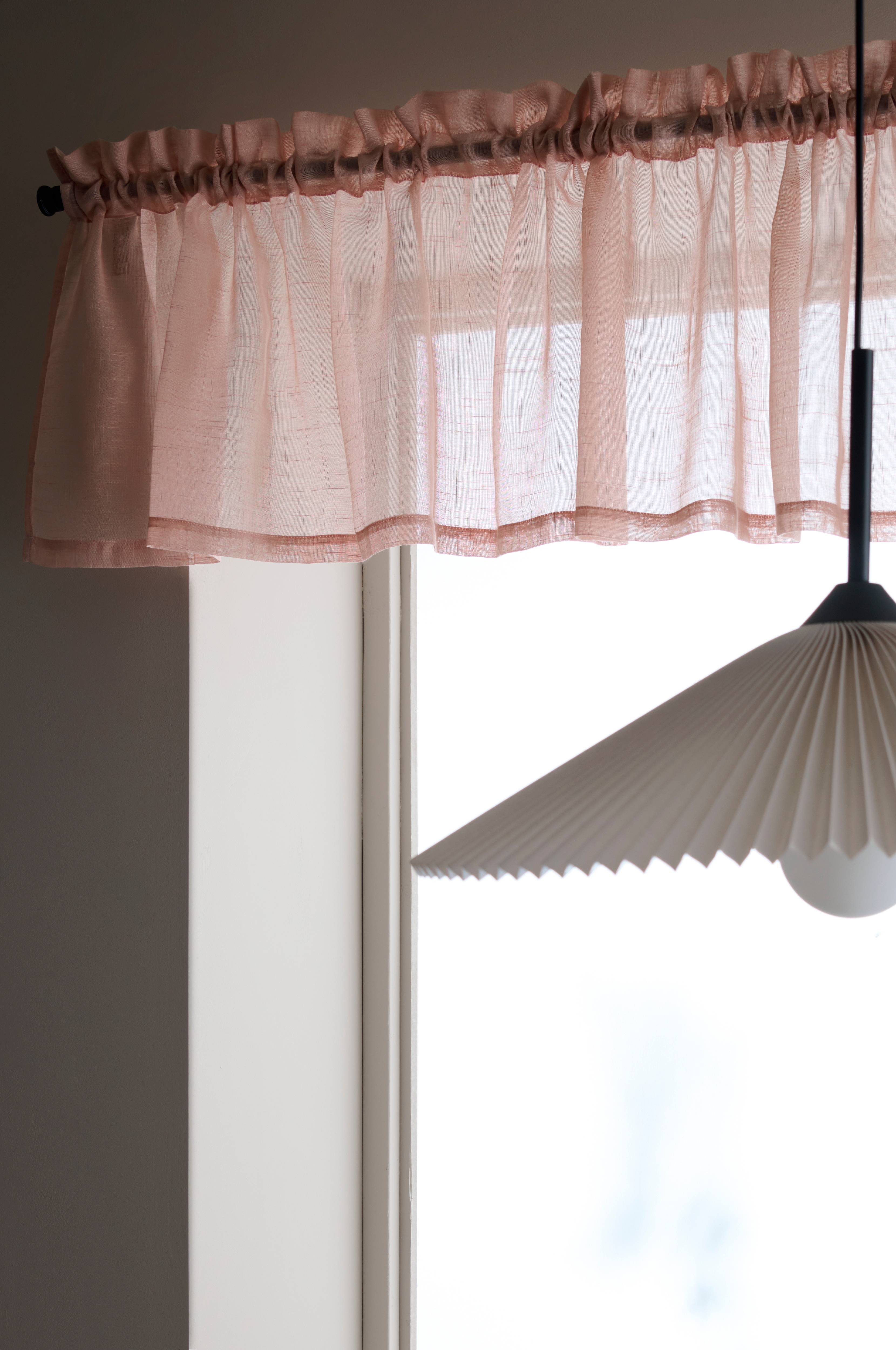 Kanalkappa av skir polyester med struktur i linnelook. Kanal med 5 cm rynkhuvud. Stl 50x250 cm.