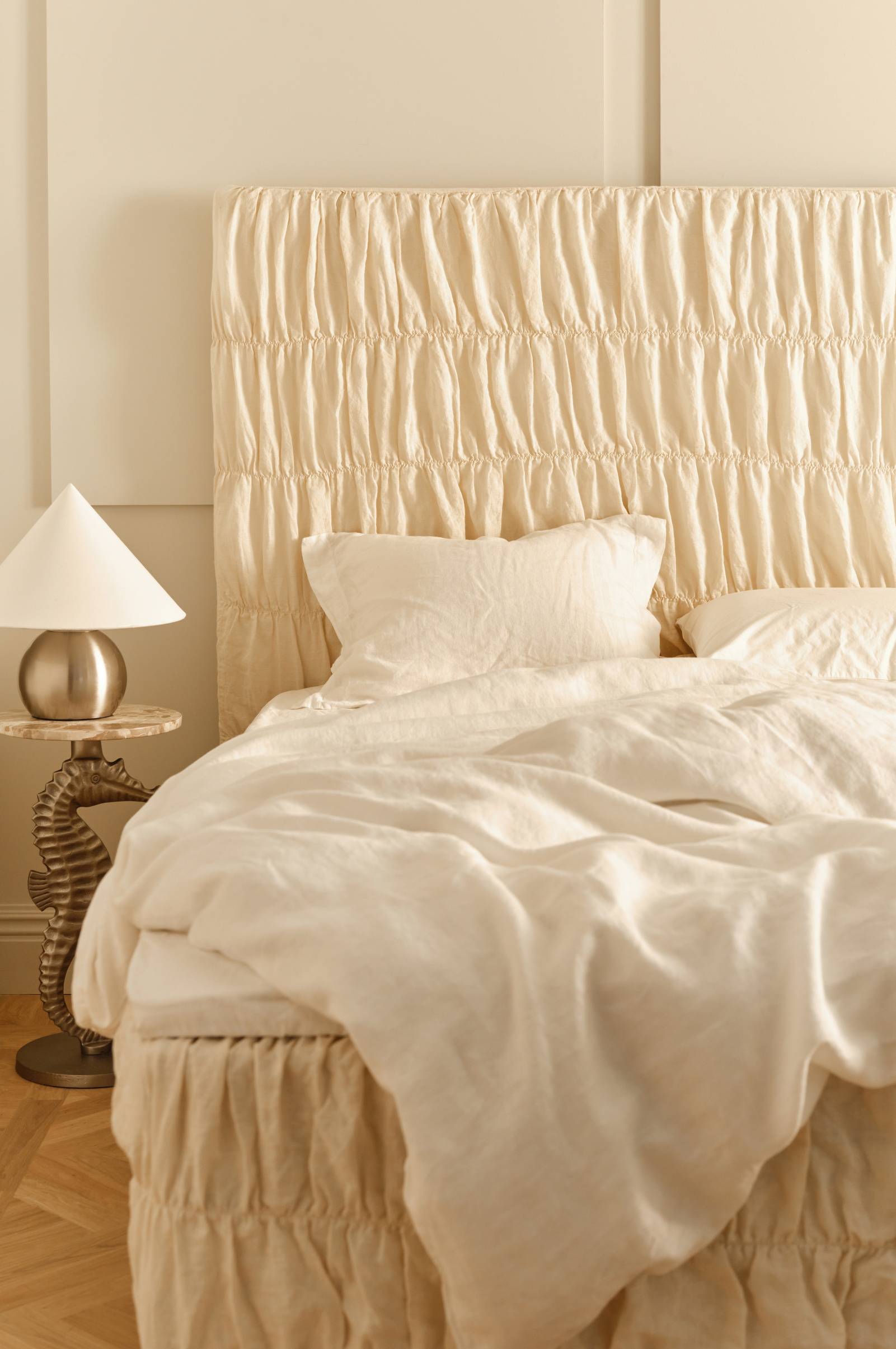Ett överdrag i linne som du trär över din sänggavel. Överdraget har en lös passform, beroende på hur djup din sänggavel är, och sängen får ett avslappnat uttryck.