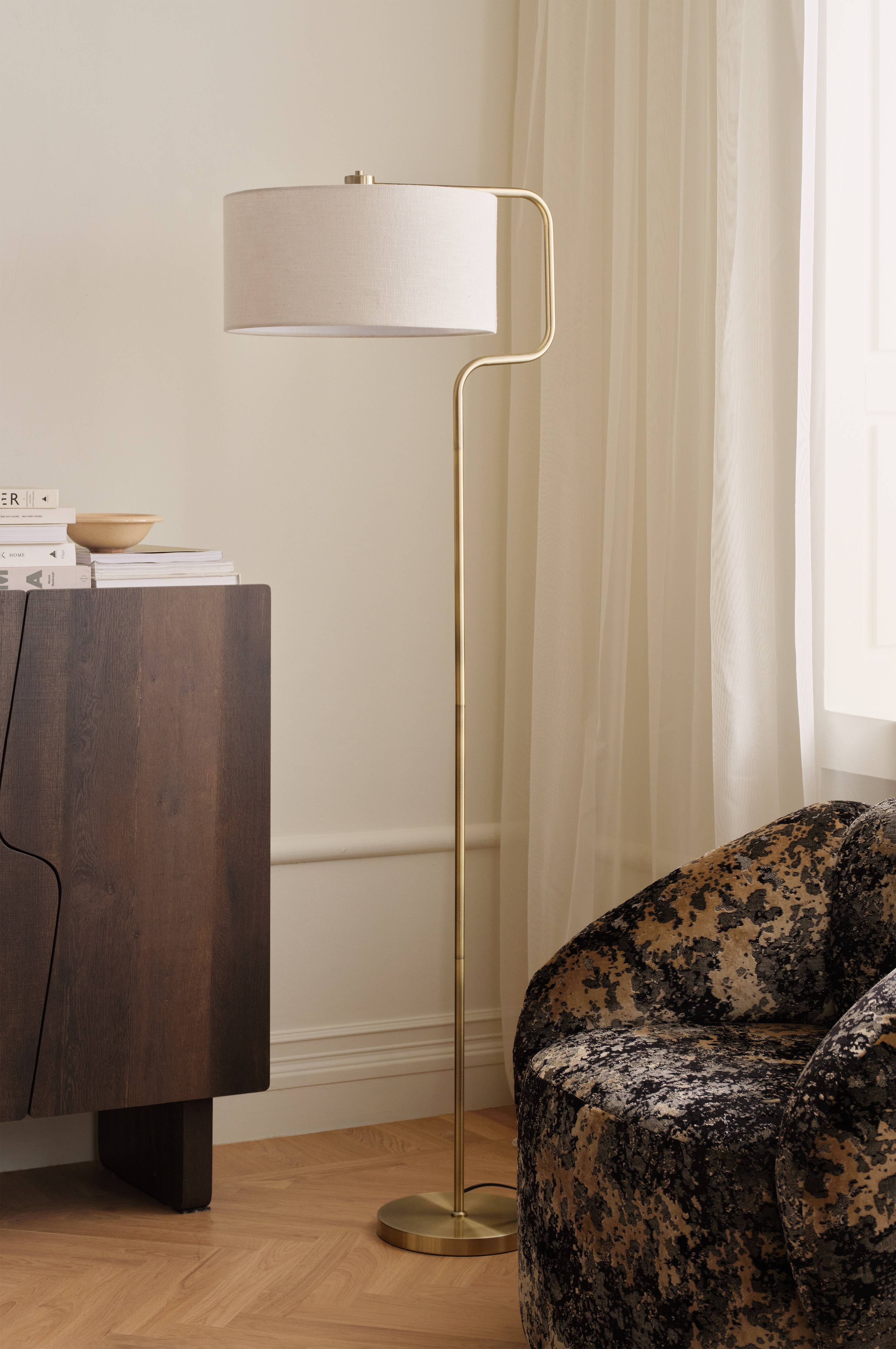 Golvlampa med fot i metall . Skärm i linnetyg med lätt struktur.Mått på skärmen: Diameter 40 cm, höjd 20 cm.Mått på foten: Diameter 25 cm, höjd 3 cm.Svart sladd med golvströmbrytare. Ljuskälla ingår ej.
