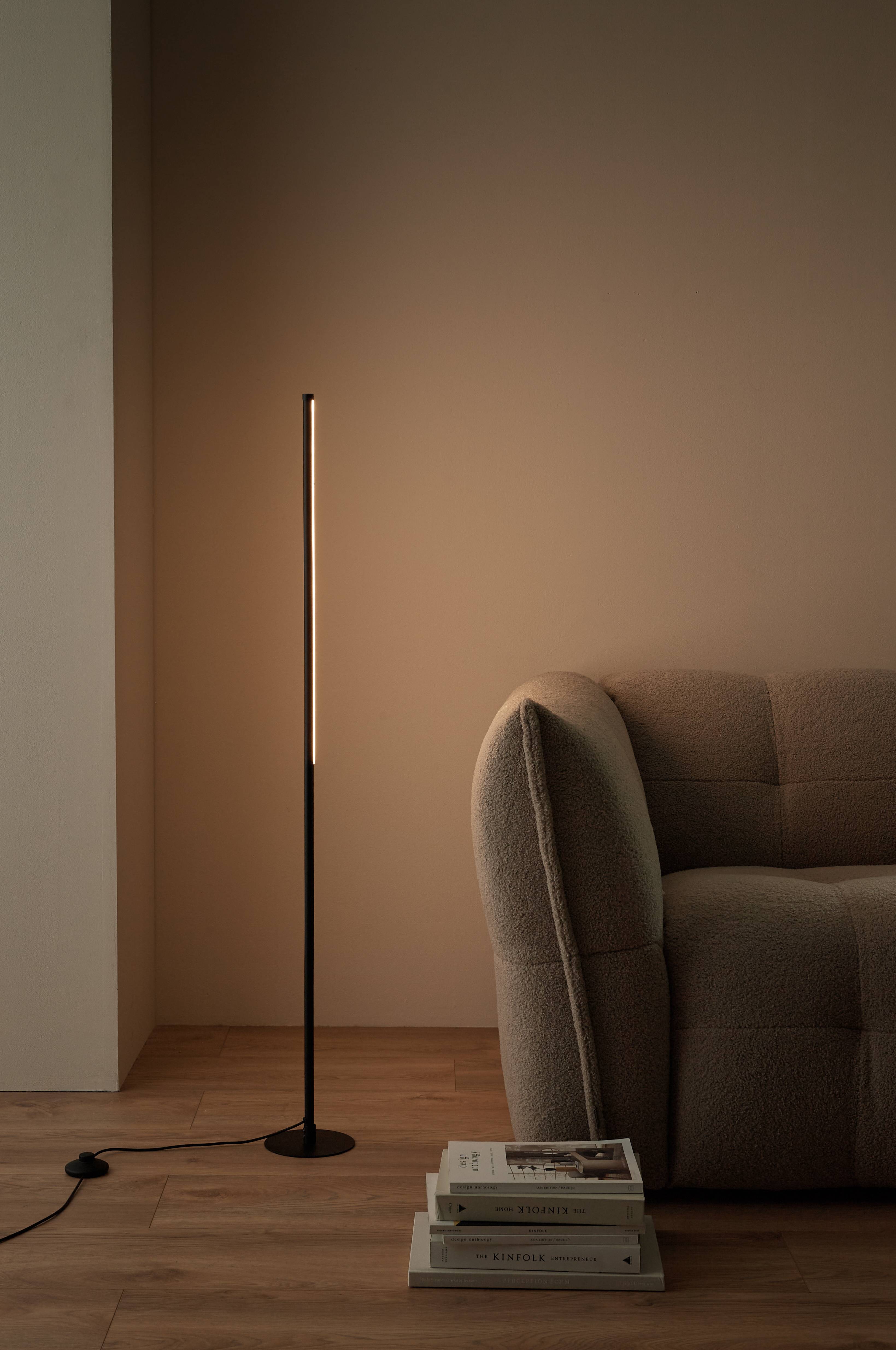Golvlampa av metall i modern design med integrerad LED-ljuskälla. Höjd 125 cm, varav 60 cm LED-ljusspridare av silikon. Plastsladd med fotströmbrytare.