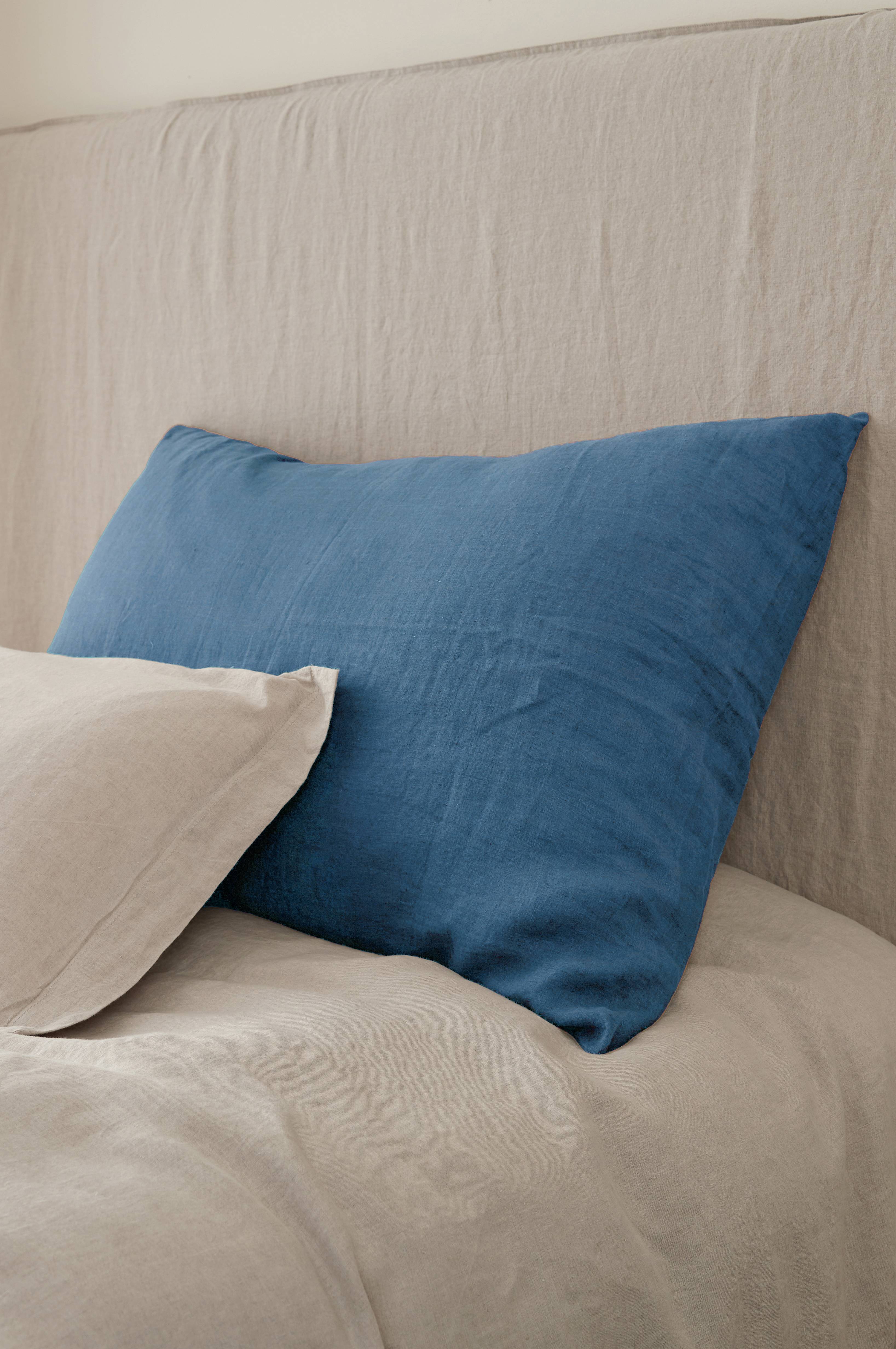 Stort hotellörngott med sovkudde. Örngottet är i mjuk, tvättad linnekvalitet, gjort av franskt lin. Kudden är medelhög med fyllning av silikoniserad hålfiber (1400 g) och överdrag av ekologisk bomullspercale med trådtäthet 200TC.