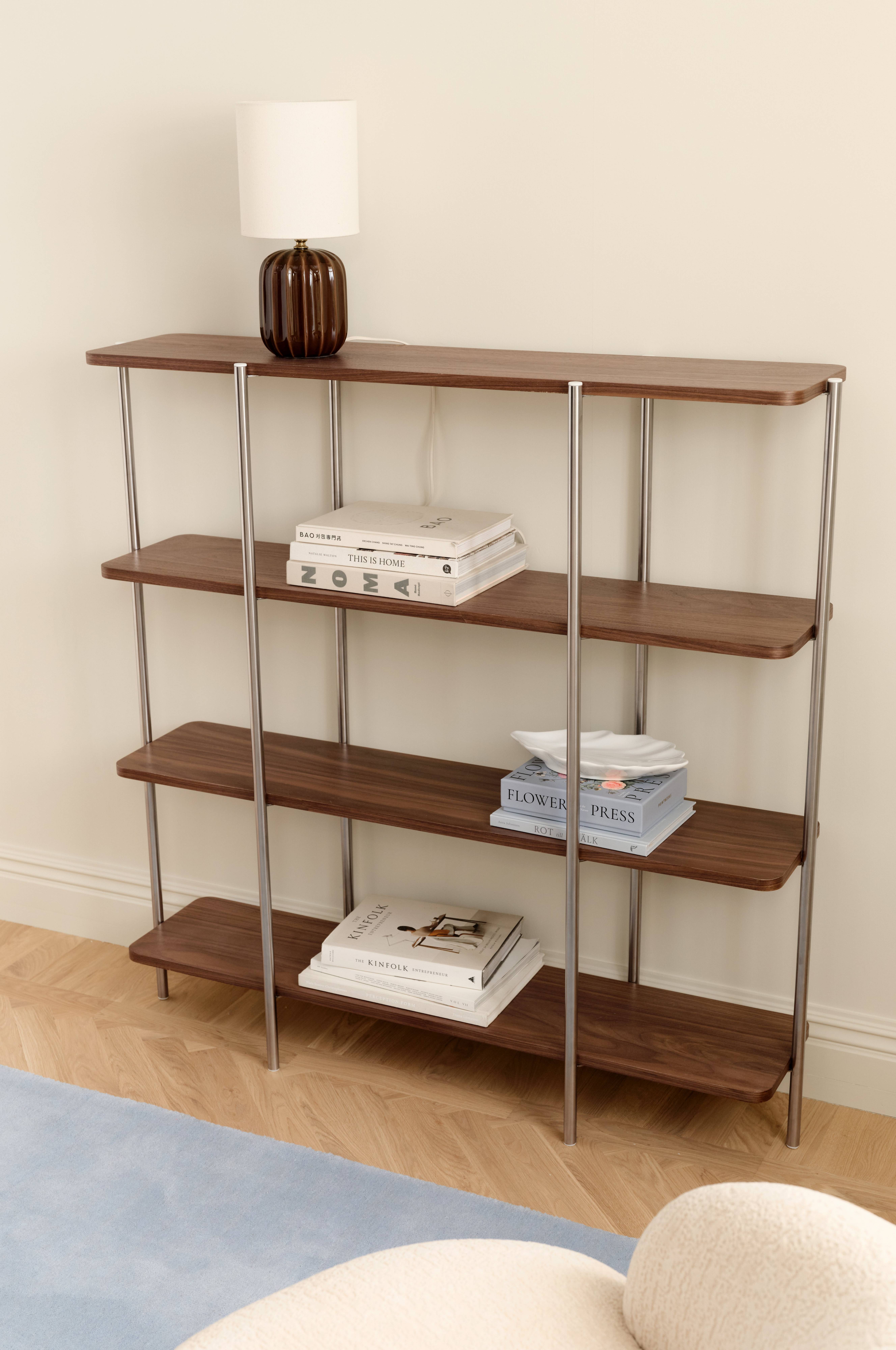 • Fyra fasta hyllplan i MDF och valnötsfaner