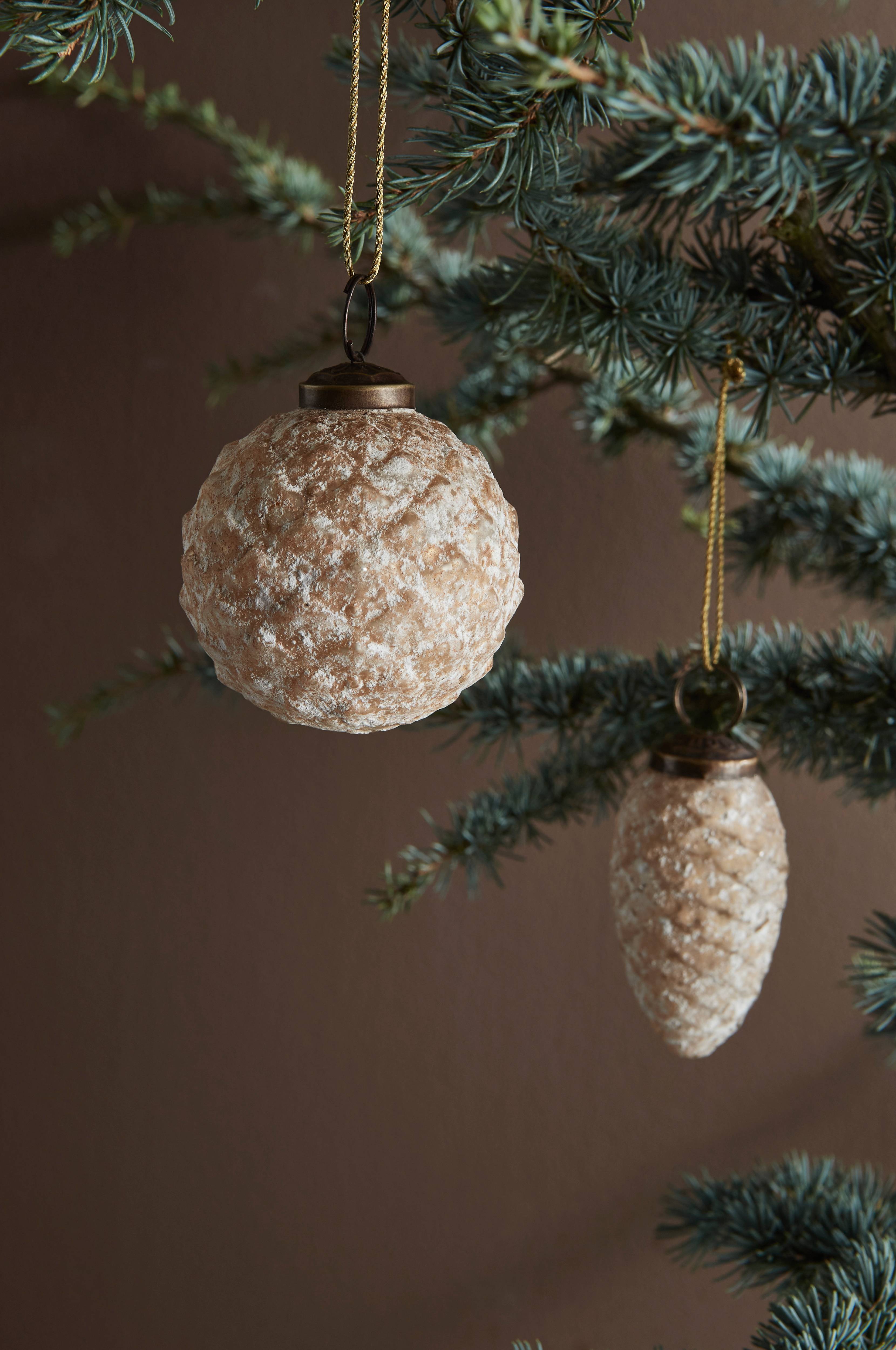 Dekorativa julgranshängen i 2-pack. Av glas och metall i matt finish. Höjd 9,8 cm resp 4,7 cm. Guldfärgat textilsnöre för upphängning.
