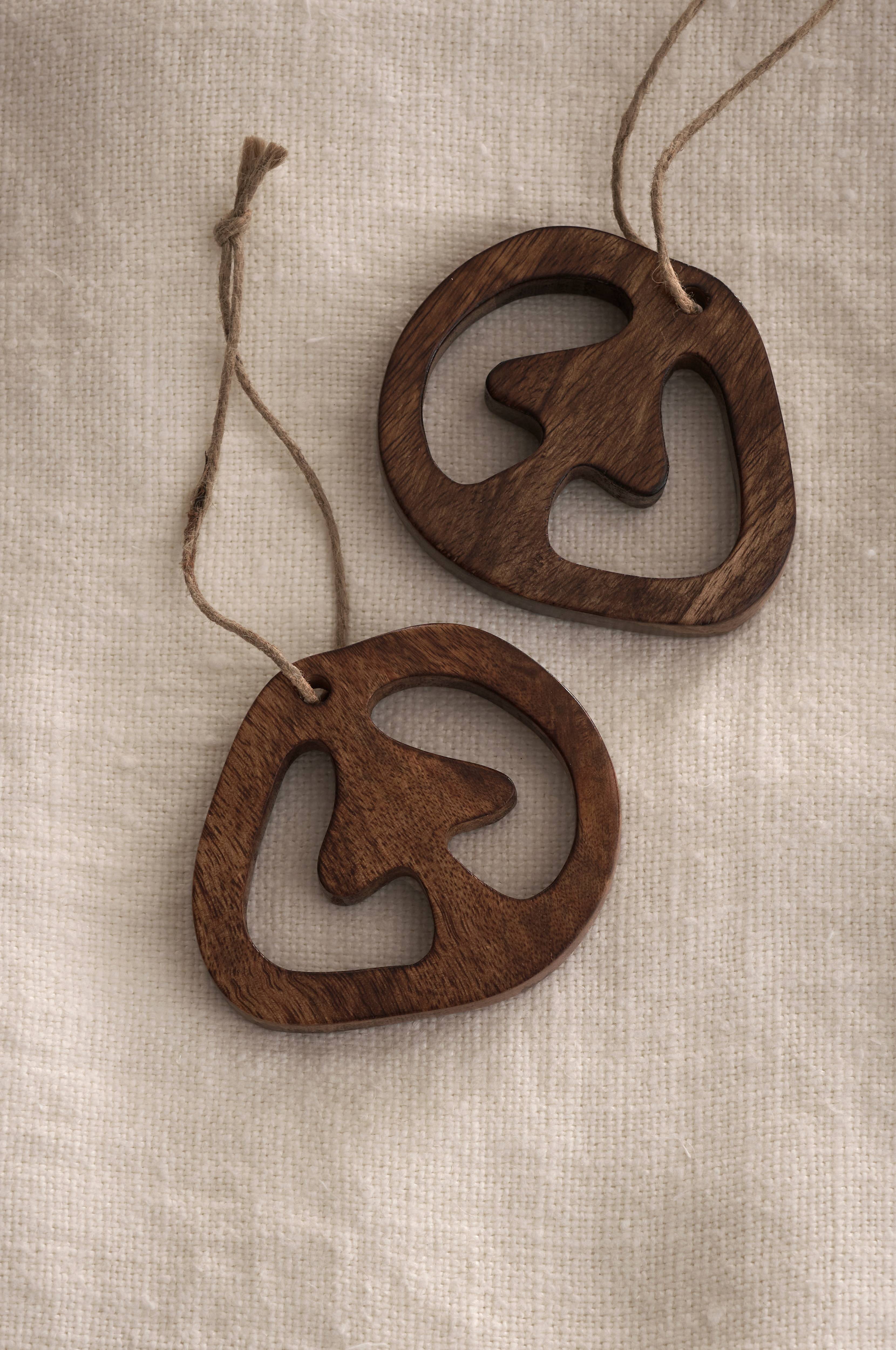 Julgranshängen i 2-pack. Av mangoträ i betsad, brun finish. Bredd 9 cm, höjd 7,5 cm, djup 1 cm. Snöre för upphängning..