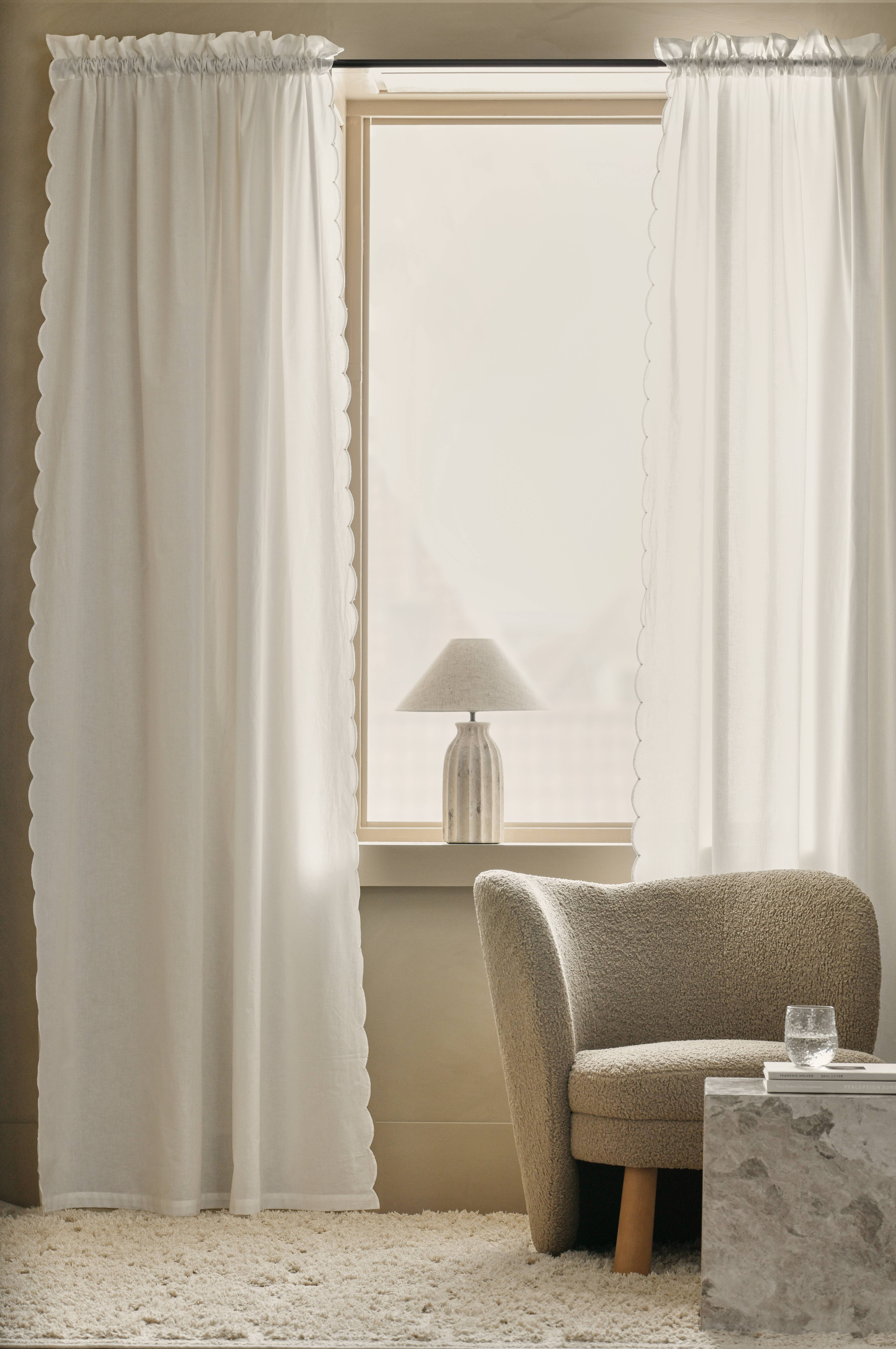 Två kanallängder i bomull. Vågformade kanter på sidorna med overlocksöm. Sydd kanal upptill.