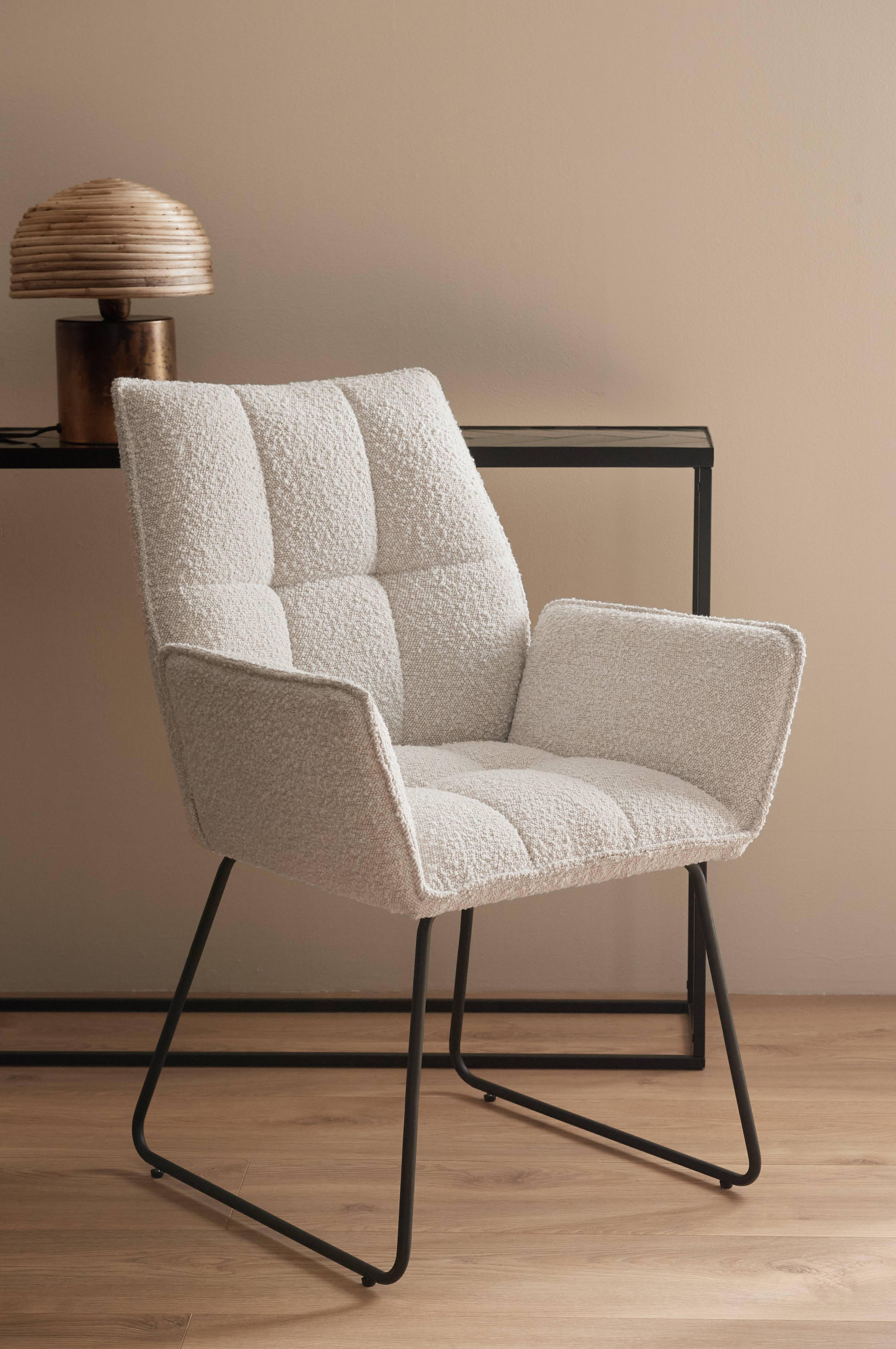 Två karmstolar med klädsel i bouclétyg som har ett sytt, dekorativt rutmönster. Passpoalkanter runt om. Skumfyllning i rygg, sits och armstöd. Underrede av pulverlackad metall. Max viktbelastning 130 kg. Ryggstödets höjd 42 cm. Höjd till armstöd 65 cm.
