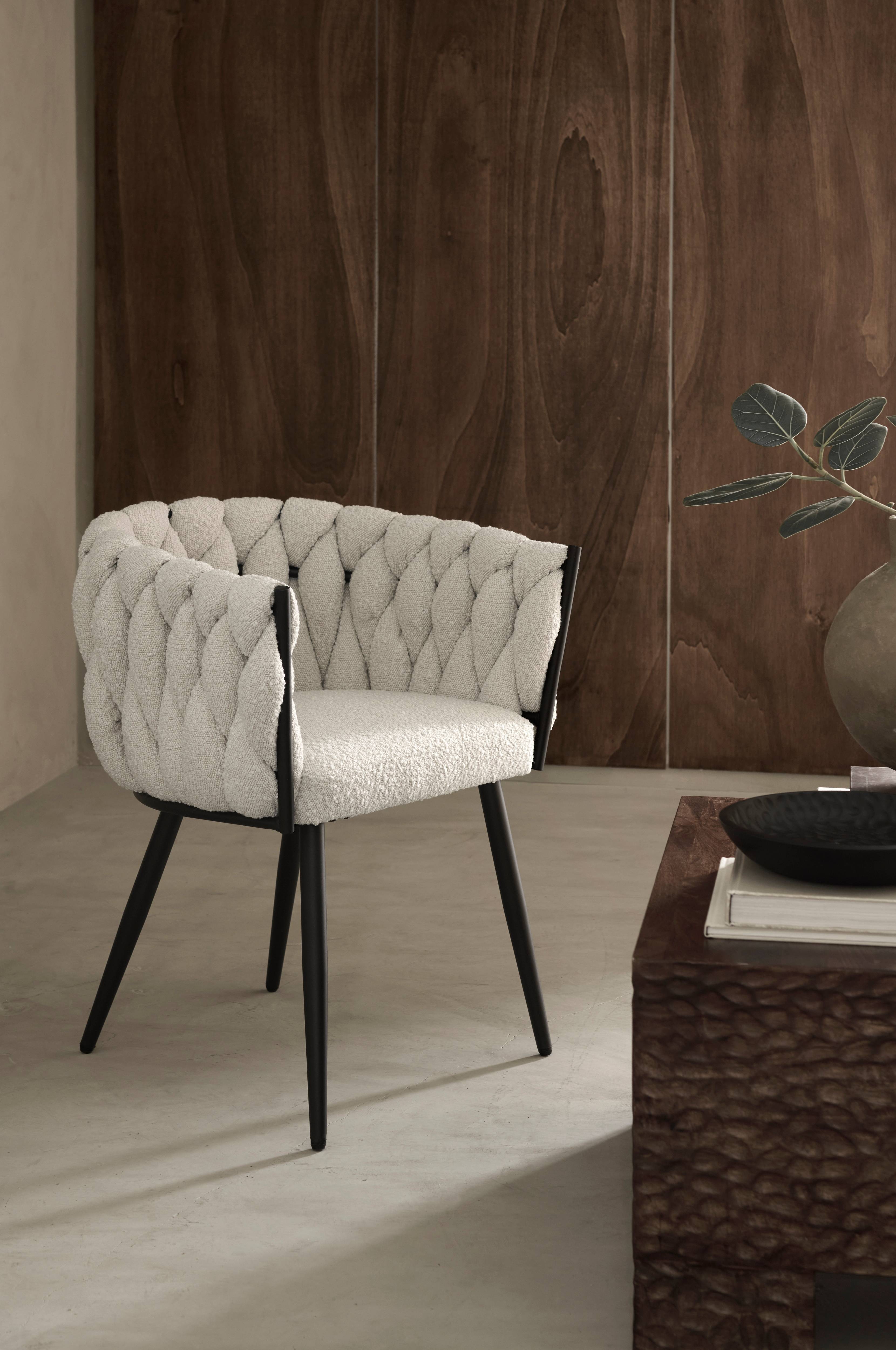 Karmstol med ben och stomme i pulverlackad metall och klädsel i bouclétyg med flätat mönster. Skumfyllning. Levereras monterad.