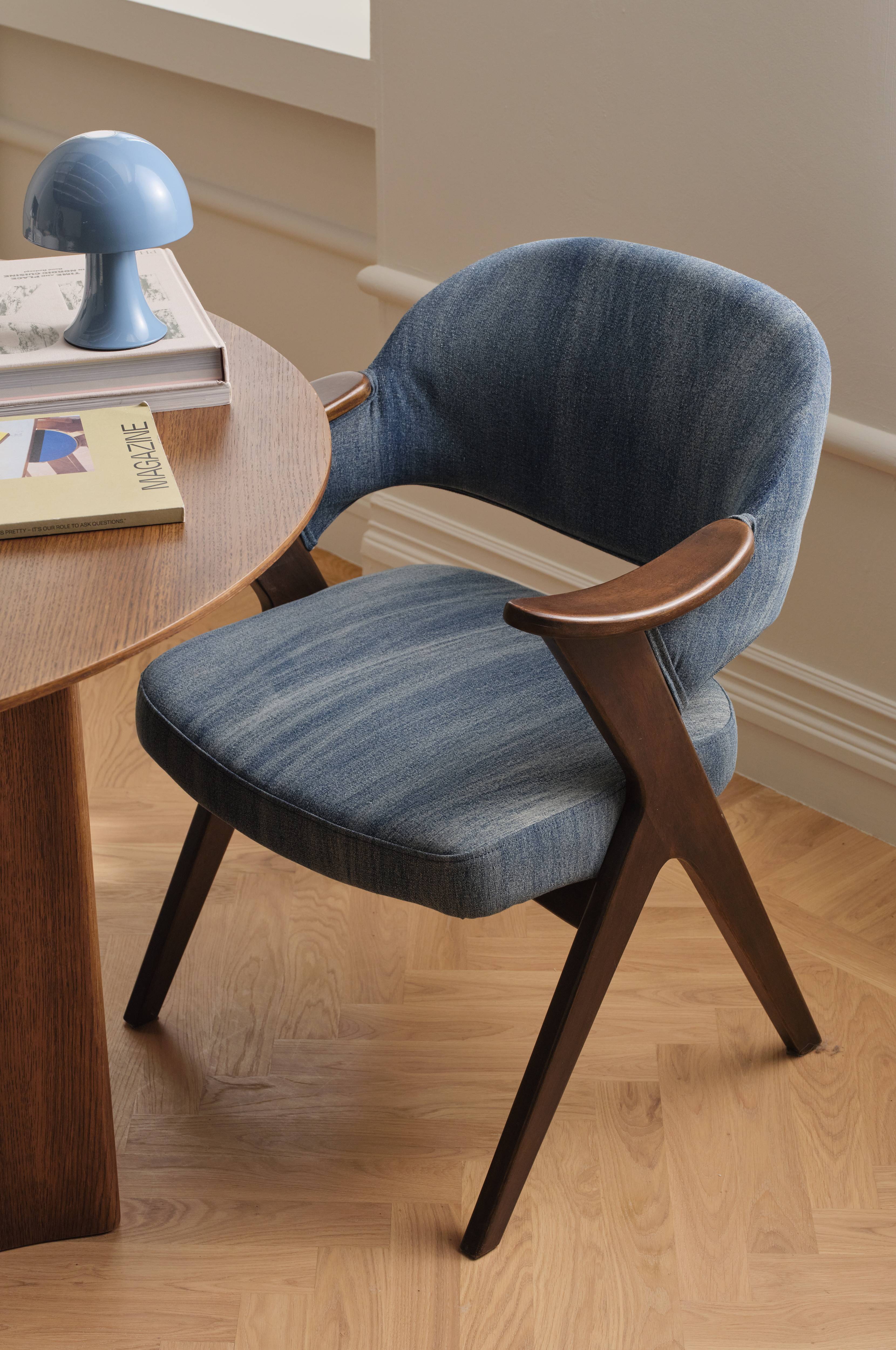 • Karmstol med armstöd och ben i teak • Stoppad sits och rygg med klädsel i denimlook • Stomme i plywood • Skumfyllning