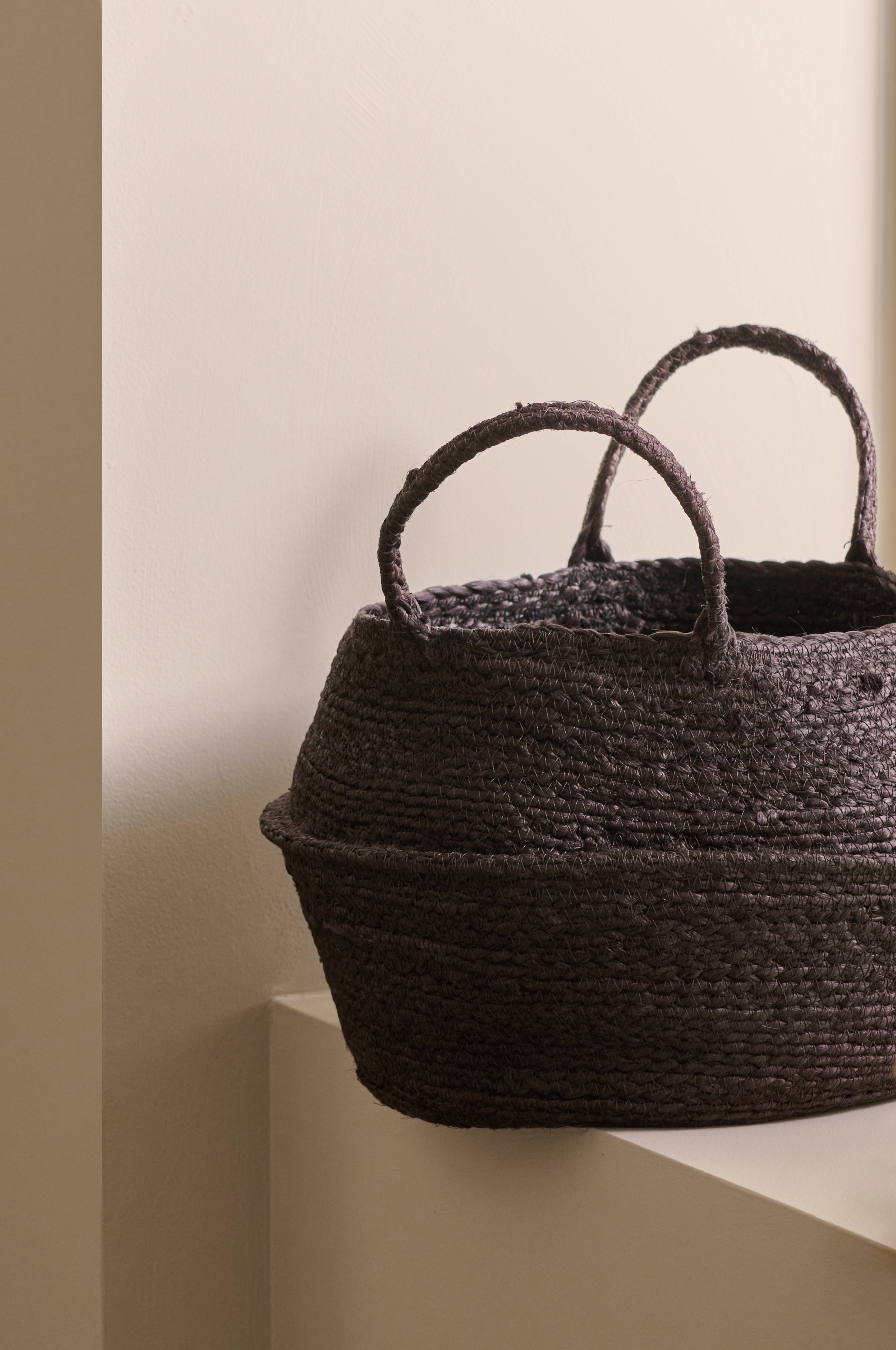 Förvaringskorg tillverkad av sjögräs med två bärhandtag. Höjd utan handtag 24 cm. Diameter mitten 32 cm.