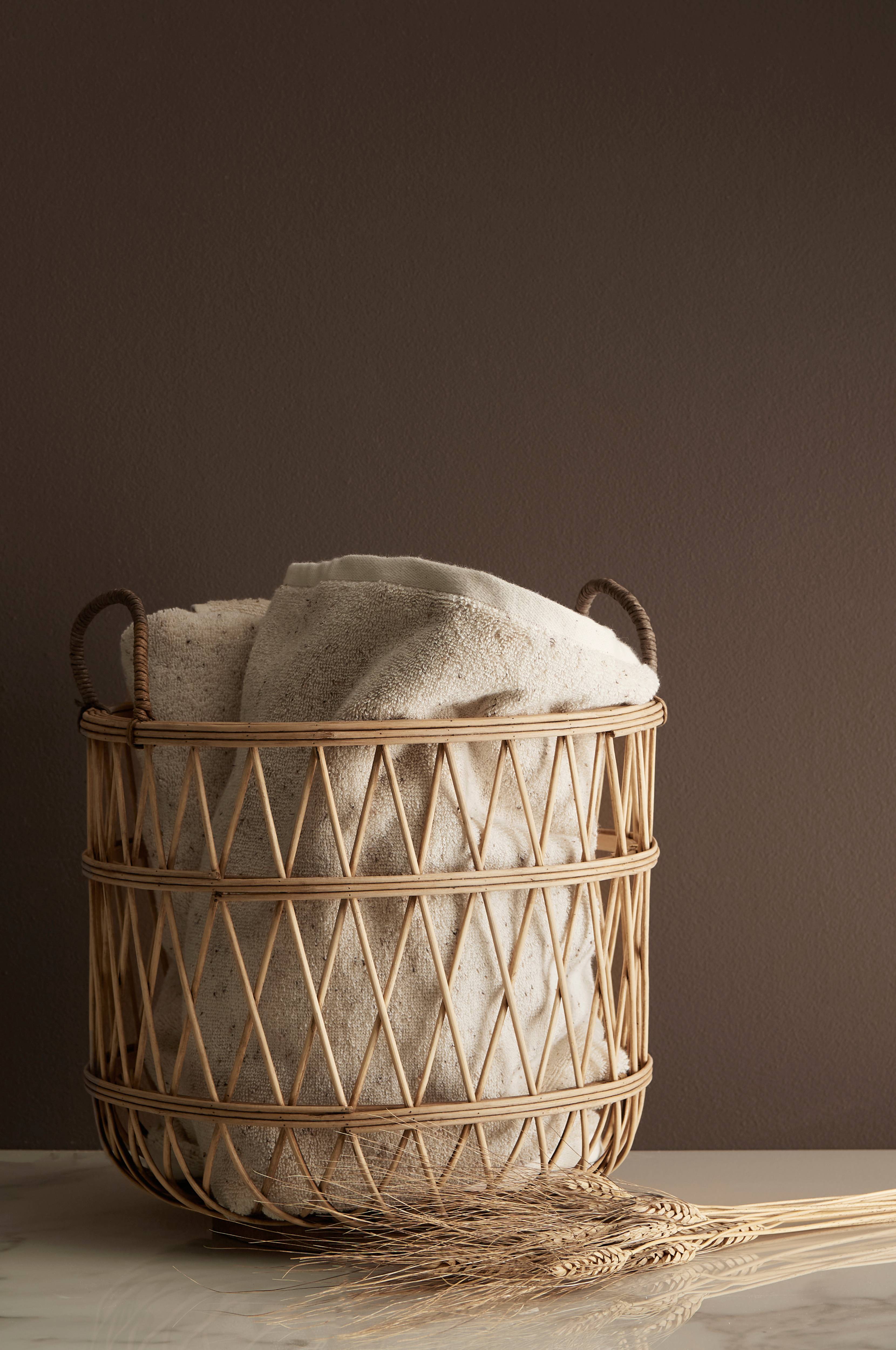 Korg av rotting med bottenplatta av MDF. Två handtag. Höjd 29 cm. Diameter upptill 32 cm.