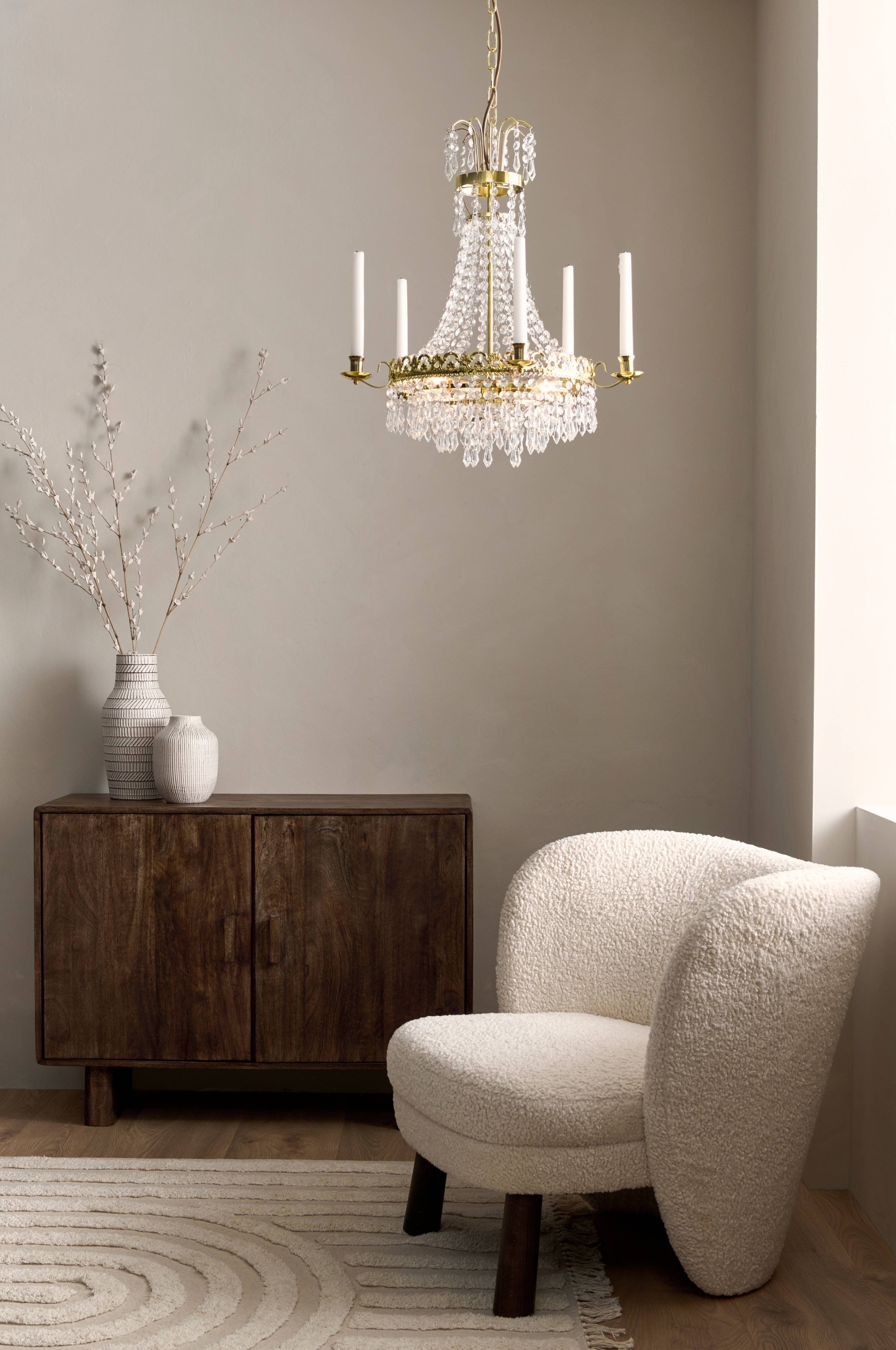Metallstomme med handslipade prismor i blyfritt glas. Fem ljushållare. Ø 24 mm. Höjd 60 cm. Total Ø 54 cm inkl. ljushållare. Max takavstånd 120 cm. Kedja 50 cm, kan kortas. 3xE14. Max 3x40W.